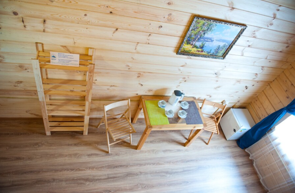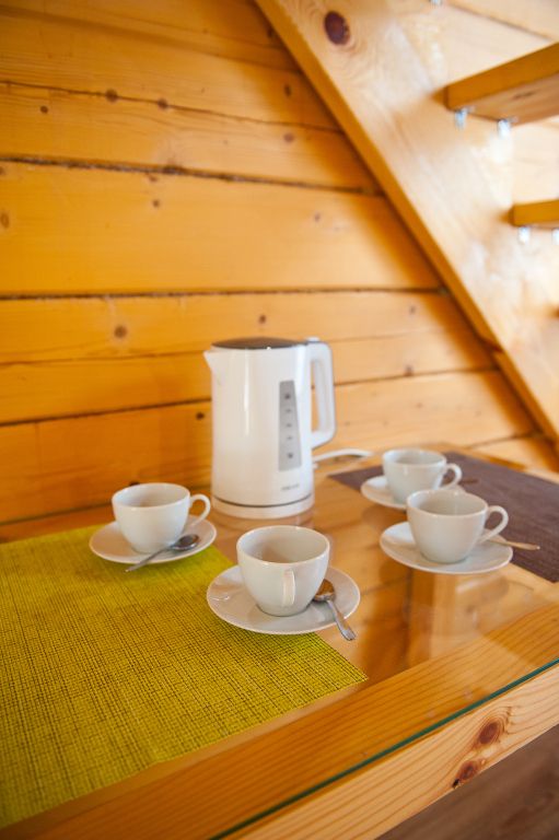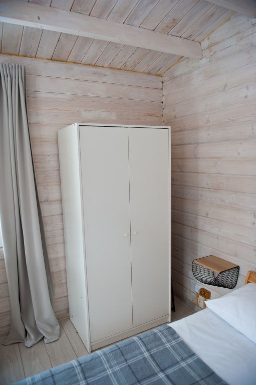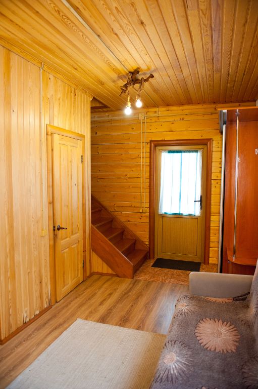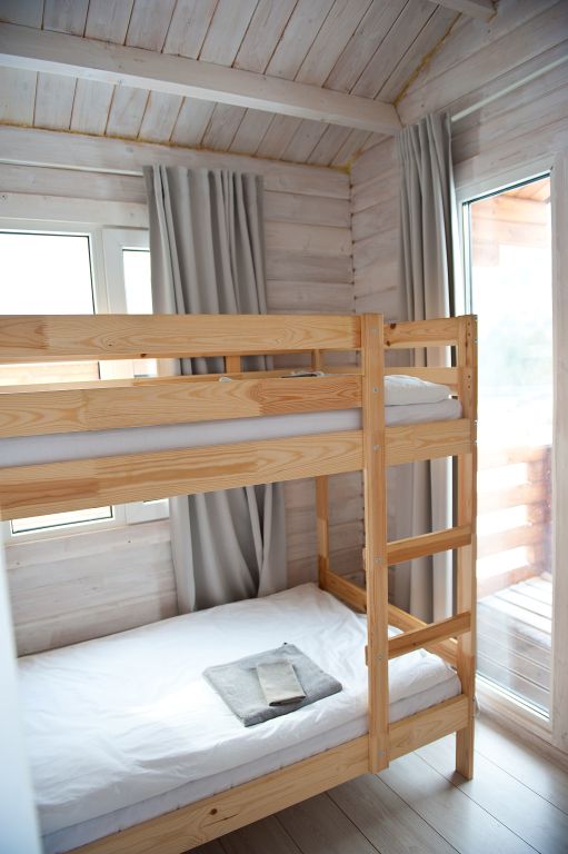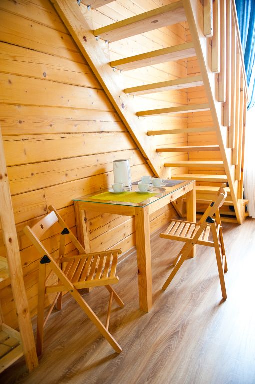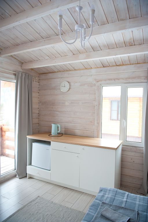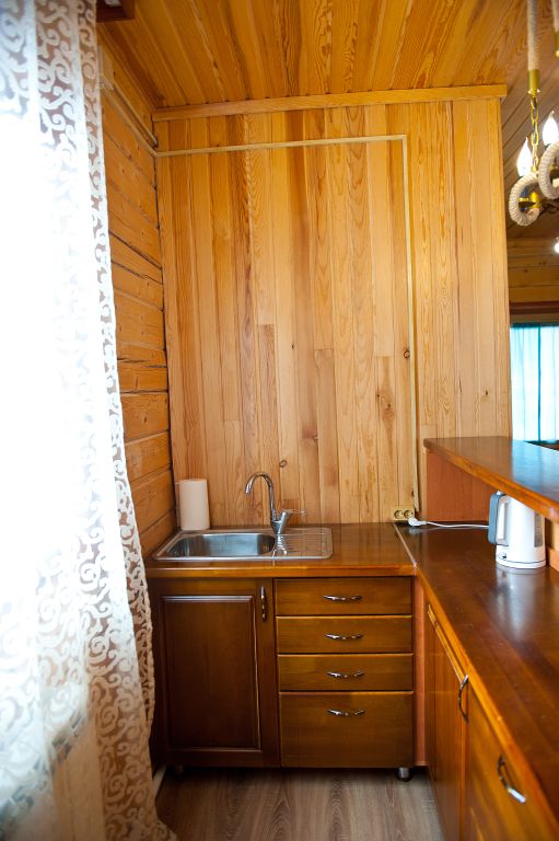 На первом этаже находится мини-кухня, оборудованная всем необходимым для самостоятельного приготовления пищи, а также уютная зона отдыха с мягкой мебелью. На каждом этаже предусмотрены спальные места, что делает дом удобным для семейного отдыха или компании друзей.