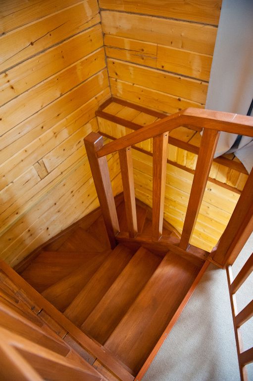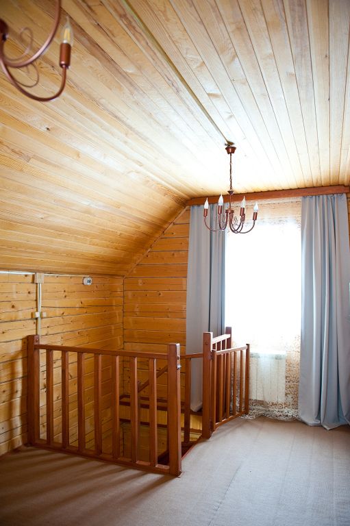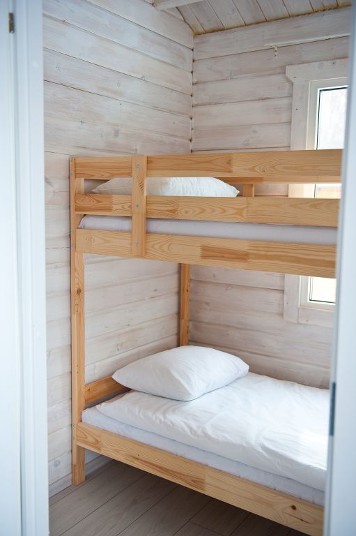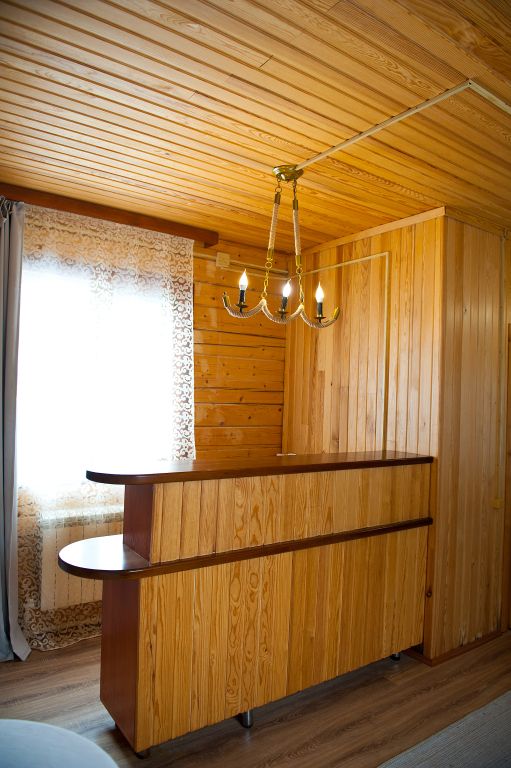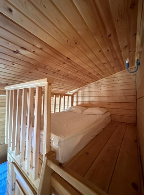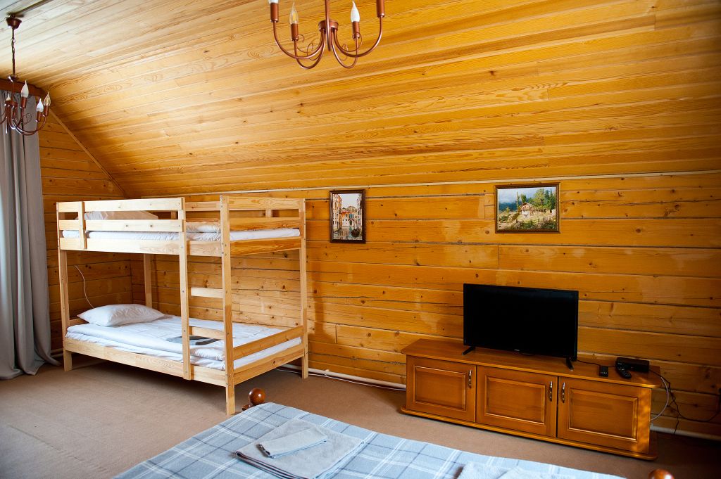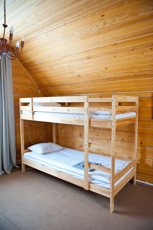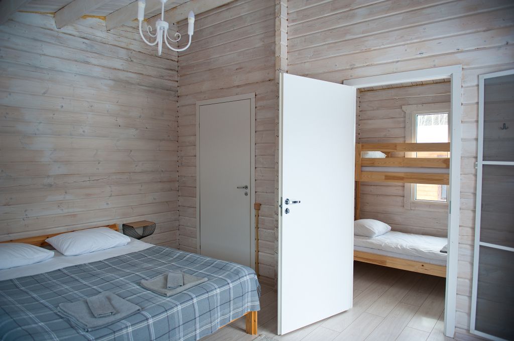 На первом этаже находится мини-кухня, оборудованная всем необходимым для самостоятельного приготовления пищи, а также уютная зона отдыха с мягкой мебелью. На каждом этаже предусмотрены спальные места, что делает дом удобным для семейного отдыха или компании друзей.
