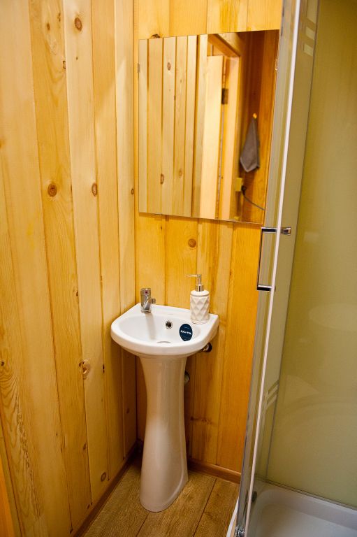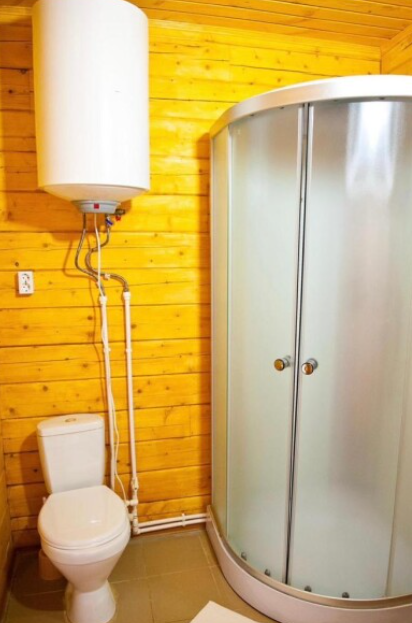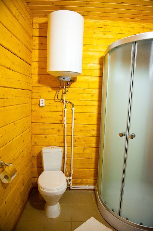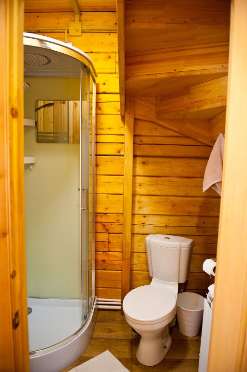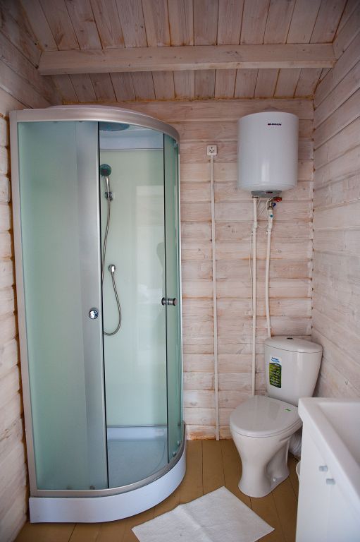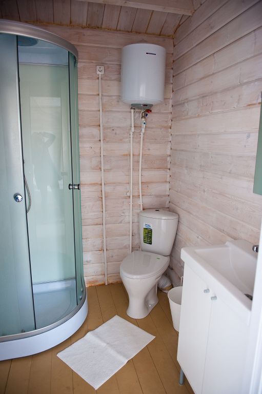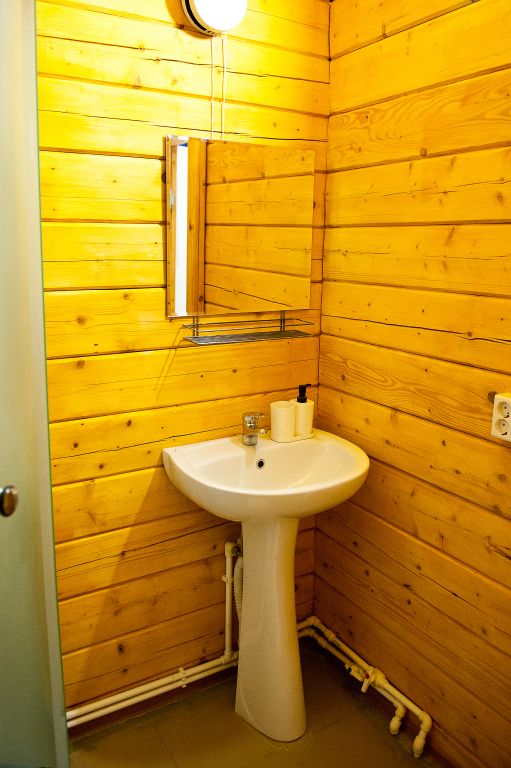Санузел оснащен всеми удобствами, включая душ, раковину и туалет, обеспечивая полный комфорт проживания. Интерьер выполнен в тёплых, натуральных тонах, с использованием дерева, что придаёт дому атмосферу уюта и гармонии с окружающей природой.