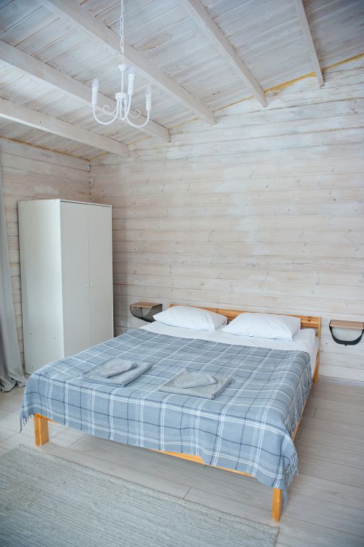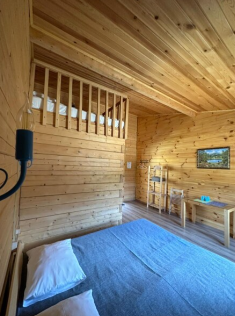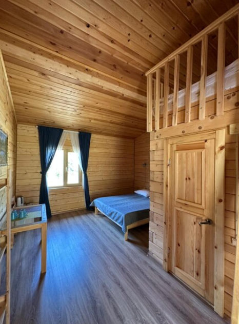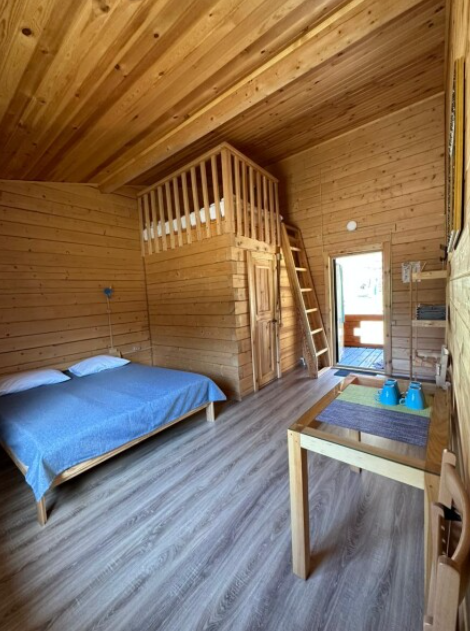 В номере установлена удобная двуспальная кровать, а также есть дополнительное спальное место для еще одного или двух гостей. Ванная комната оборудована всем необходимым: душем, туалетом и раковиной. Натуральные материалы в интерьере и вид на реку делают это пространство идеальным для расслабляющего отдыха и погружения в природную гармонию.