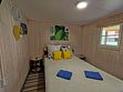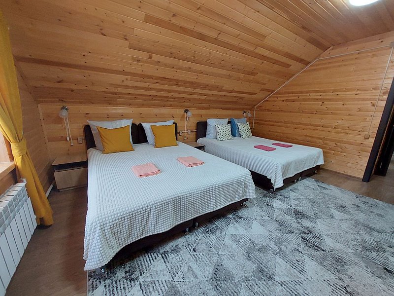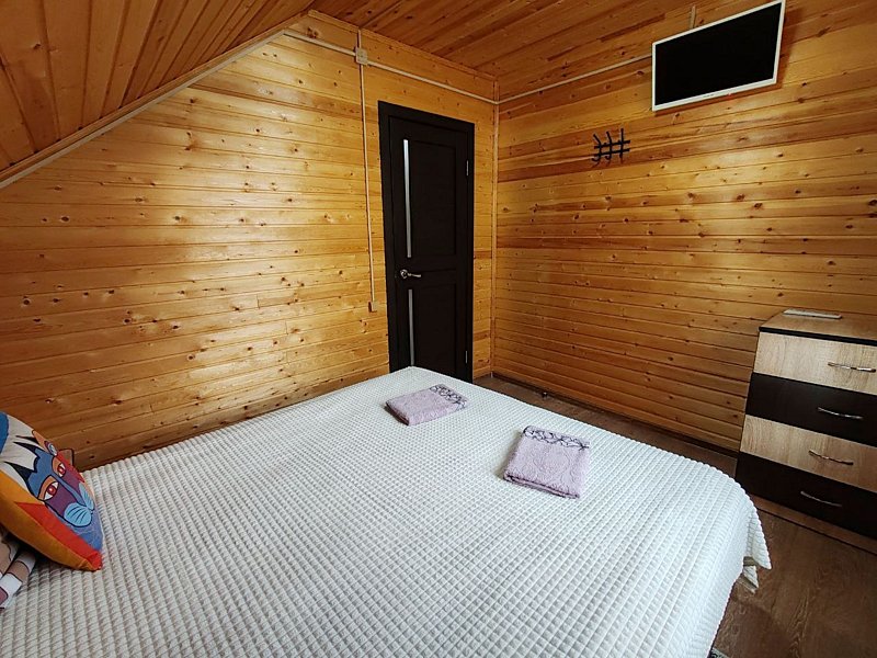 В номерах двуспальная кровать (постельное белье + полотенце), прикроватные тумбочки, комод, кресло кровать, телевизор и раскладной диван (доп. место), WI-FI.