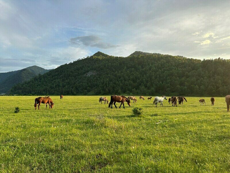 Выход на маршрут. После короткого восхождения вы окажетесь на живописной поляне, недалеко от массивной скалы Кресло Сартакпая, откуда открывается красивый вид на реку Катунь. После остановки для фотографий.