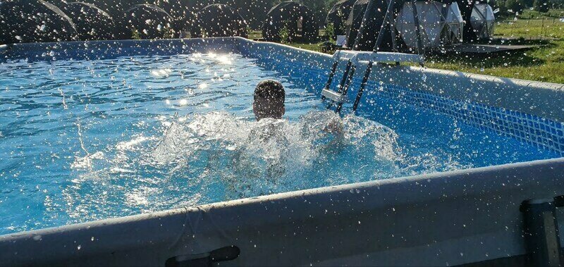 Большой бассейн с каркасной конструкцией наполняется чистейшей артезианской водой, добываемой из глубокого разлома скалы на глубине 83 метра.