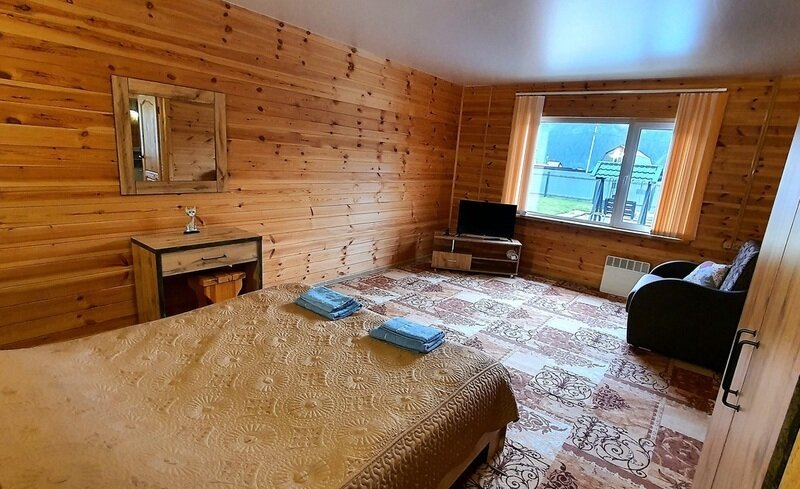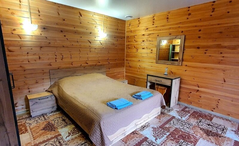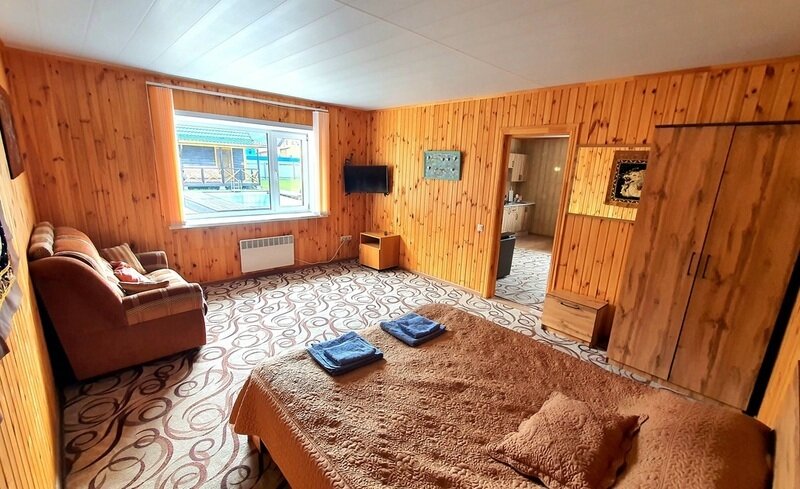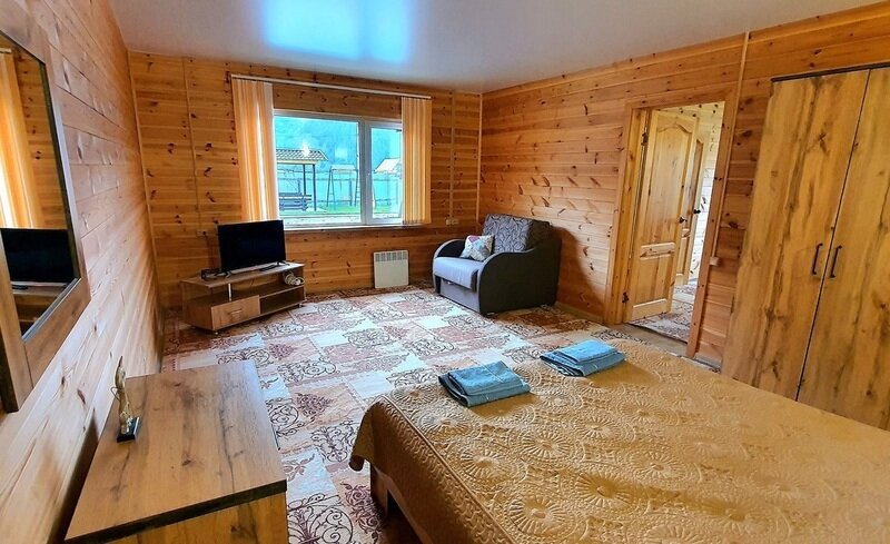 Каждый дом имеет две комнаты. В спальне есть двуспальная кровать, прикроватные тумбочки, шкаф и кресло-кровать для дополнительного размещения. Также в спальне есть телевизор. В гостиной вы найдете уютную мягкую мебель. Обеденная зона соединена с кухней, которая оборудована всей необходимой бытовой техникой для самостоятельного приготовления пищи. В каждом доме есть санузел с душевой кабиной, горячей и холодной водой. На веранде есть удобная мебель.