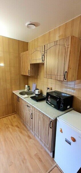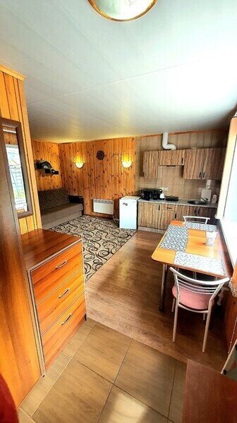 – гостиная с 1.5-м диваном + обеденная зона с кухней, оборудованной бытовой техникой (индукционная плита, СВЧ, чайник, холодильник), посуда и столовые приборы для самостоятельного приготовления пищи.