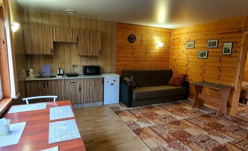 – гостиная с 1.5-м диваном + обеденная зона с кухней, оборудованной бытовой техникой ( индукционная плита, СВЧ, чайник, холодильник), посуда и столовые приборы для самостоятельного приготовления пищи.
