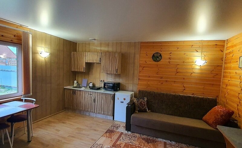 гостиная с 1.5-м диваном + обеденная зона с кухней, оборудованной бытовой техникой (индукционная плита, СВЧ, чайник, холодильник), посуда и столовые приборы для самостоятельного приготовления пищи.
