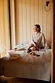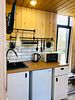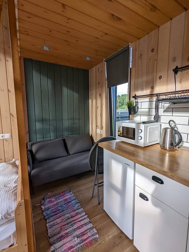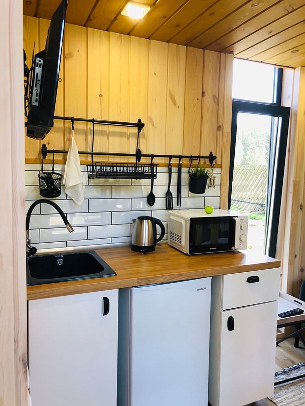 Кухонная мини-зона: холодильник, эл/чайник, микроволновая печь, все столовые принадлежности (нож, штопор, столовые приборы, консервный нож, разделочная доска), посуда (тарелки плоские большие и средние, глубокие средние, стаканы для воды, чайные чашки), средство для мытья посуды, мешки для мусора.