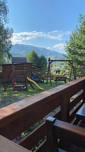 На террасе набор мебели: стол и два стула. На территории: три мангала, баня, качеля, бассейн в летнее время, детская площадка, беседки, Wi-Fi - бесплатно.