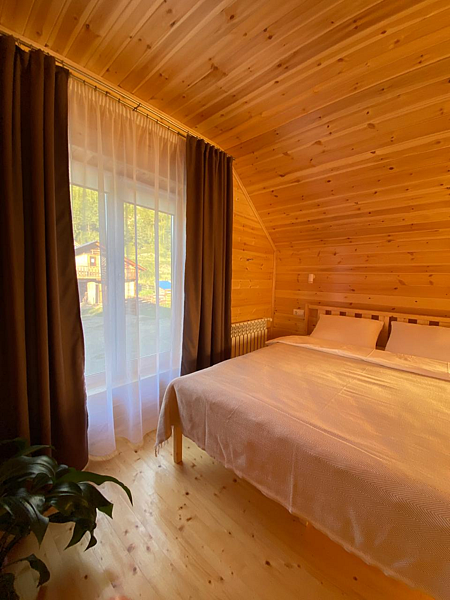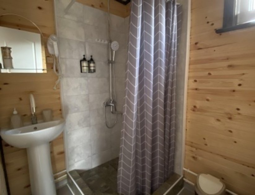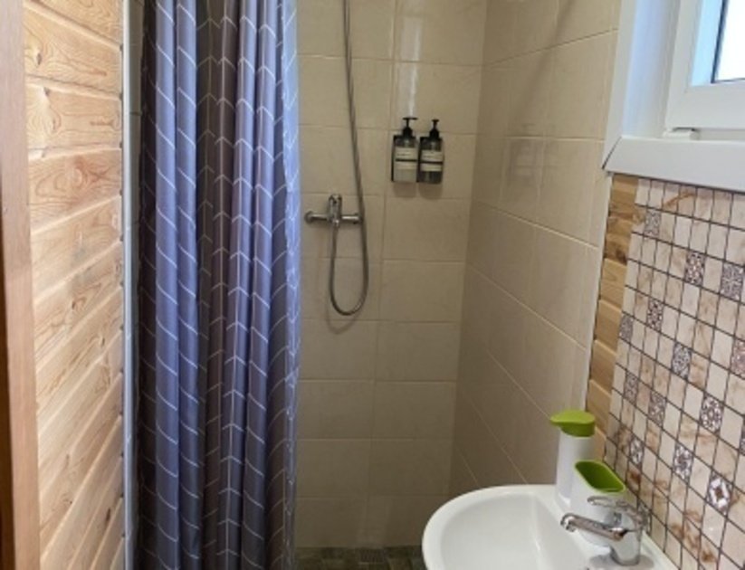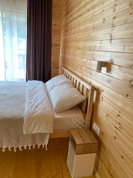 Максимальная вместимость домика четыре человека. Площадь домика двадцать квадратных метров. Домик полностью утеплен и благоустроен. На каждого гостя предусмотрен комплект полотенец. Шампунь и гель для душа, ватные палочки, ватные диски, туалетная бумага, фен для сушки волос.