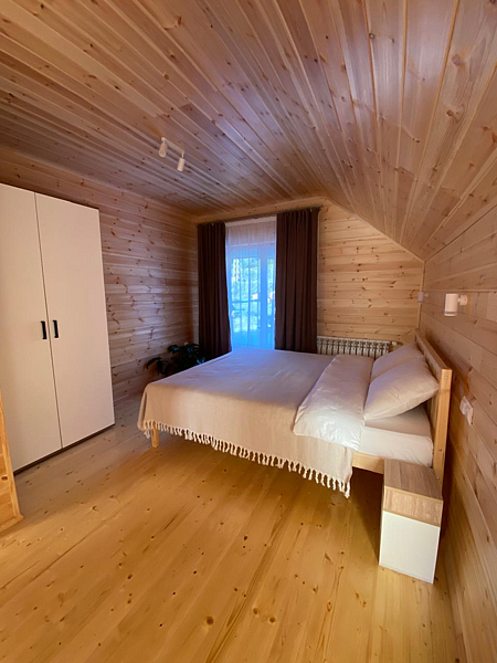 На втором этаже расположены две спальни, в каждой из которых есть двуспальная кровать размером 160х200 и односпальная кровать размером 90х200 с ортопедическими матрасами, шкаф. Также имеются утюг и гладильная доска, пылесос. В одной из спален есть балкон.
