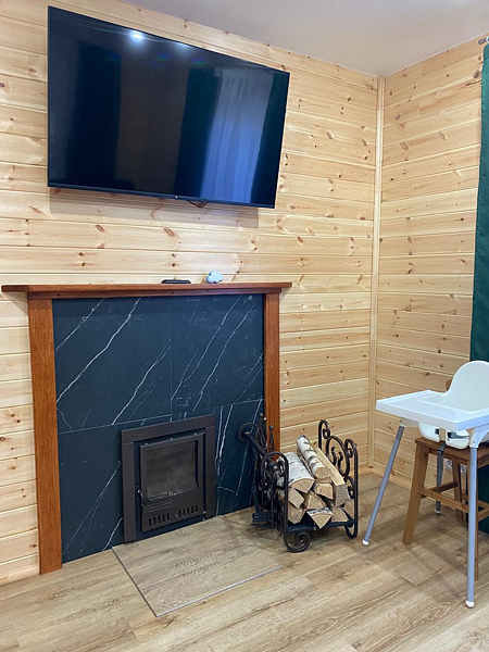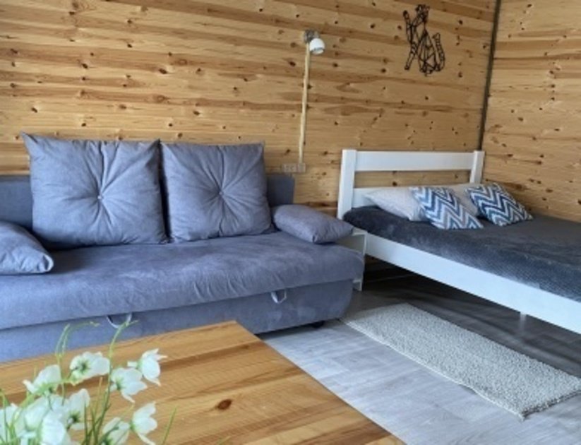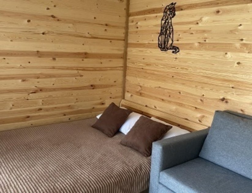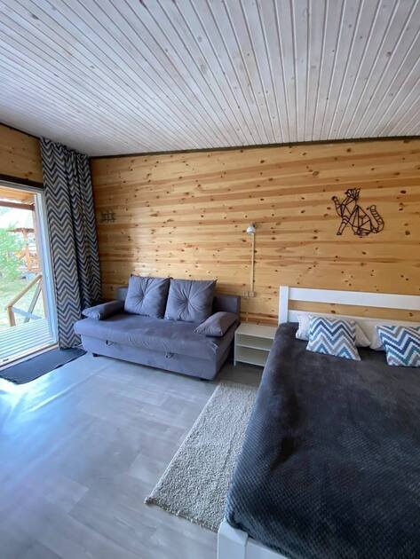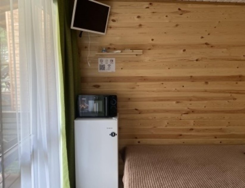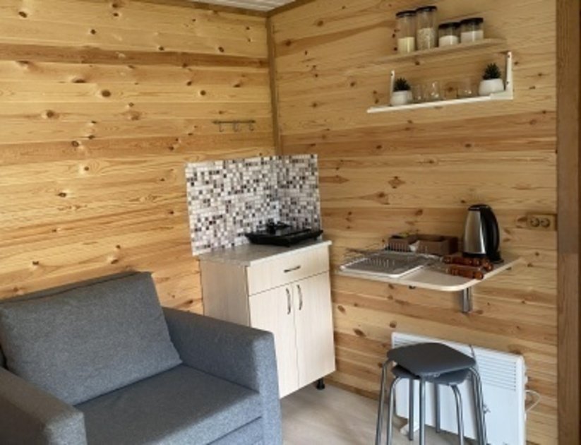 Максимальная вместимость домика: три человека. Идеально подойдет для двух человек или семейной пары с ребенком. Площадь домика составляет тринадцать квадратных метров. Домик полностью утеплен.