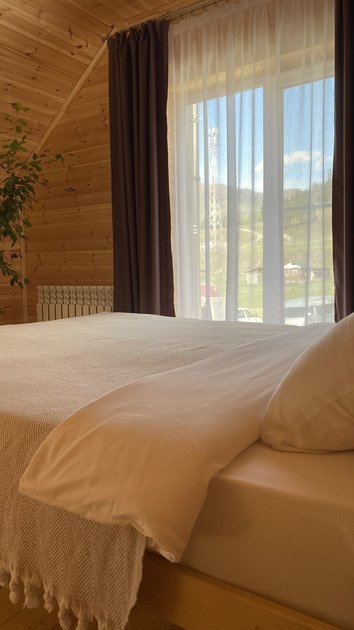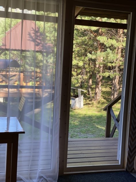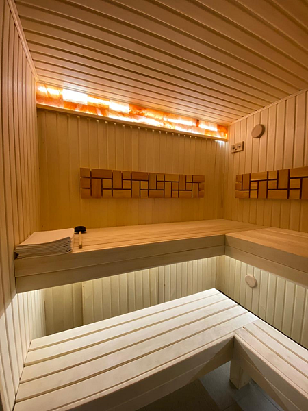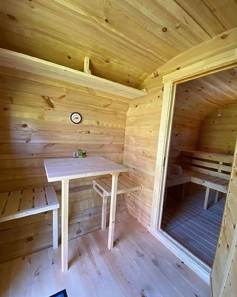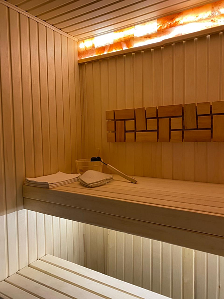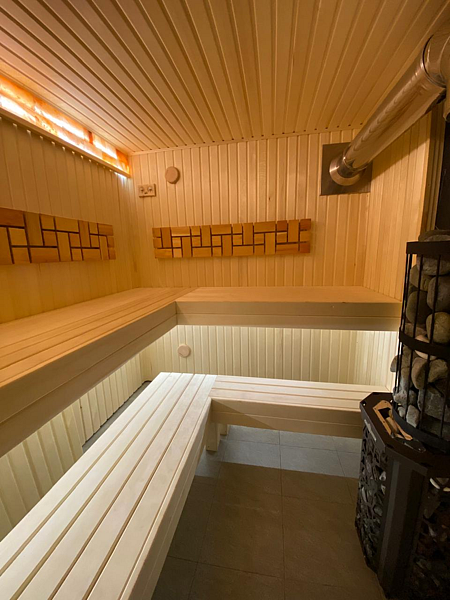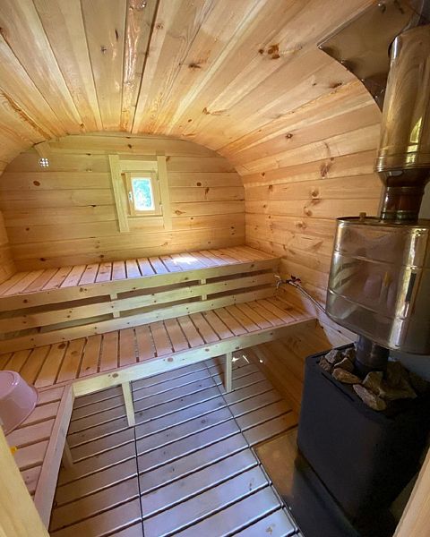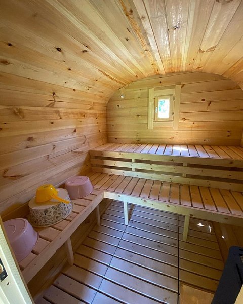 Есть сауна, которую нужно растапливать самостоятельно (одна охапка дров включена в стоимость), примерное время нагрева — 45 минут. Предоставляются шапки и простыни. Рядом с сауной есть ведро с холодной водой для обливания.