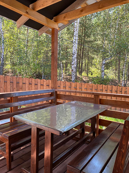 У дома своя большая терраса со столом и двумя лавочками. Мангальная зона с решеткой и шампурами. Уголь и розжиг приобретается гостями.
