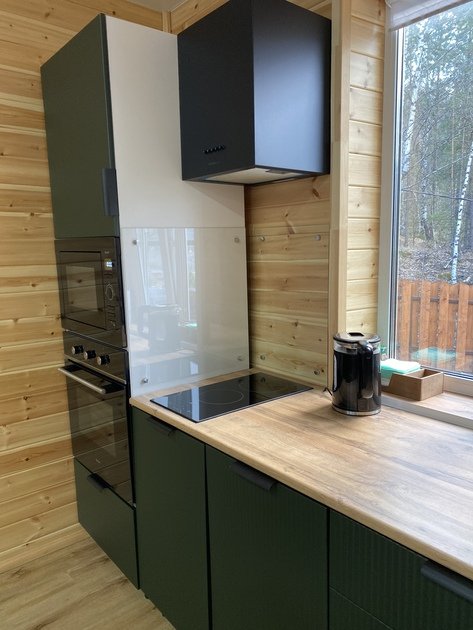 Площадь дома составляет сто пять квадратных метров, два этажа. На первом этаже находится кухня-гостиная с необходимой техникой (холодильник, индукционная плита, вытяжка, посудомоечная машина, микроволновка, духовой шкаф) и посудой (кастрюли, сковородки, кружки, стаканы, тарелки, чашки, столовые приборы и так далее), большой телевизор со смарт. Для маленьких гостей предусмотрен стульчик для кормления.