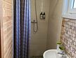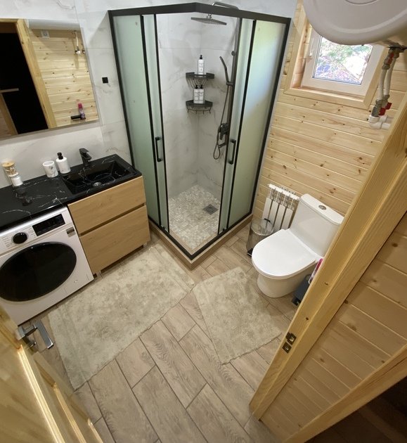 Санузел совмещённый: душевая кабина, унитаз, раковина, бойлер, стиральная машина, фен для волос, средства гигиены.