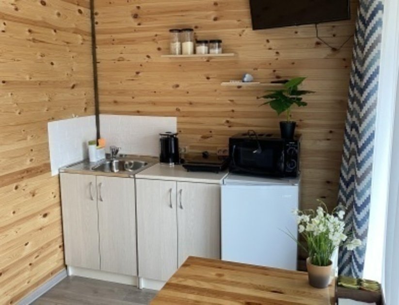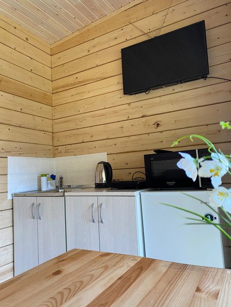 Для приготовления пищи есть все необходимое: чашки, кружки, столовые приборы, кастрюля, сковорода, моющие средства, шампура, решетка. Техника: телевизор, холодильник, электрический чайник, индукционная плита, микроволновая печь, обогреватель.