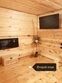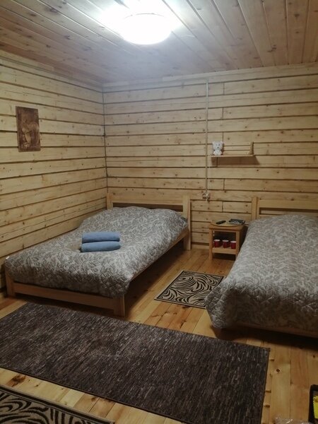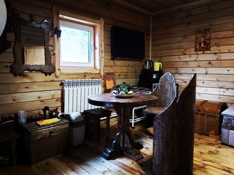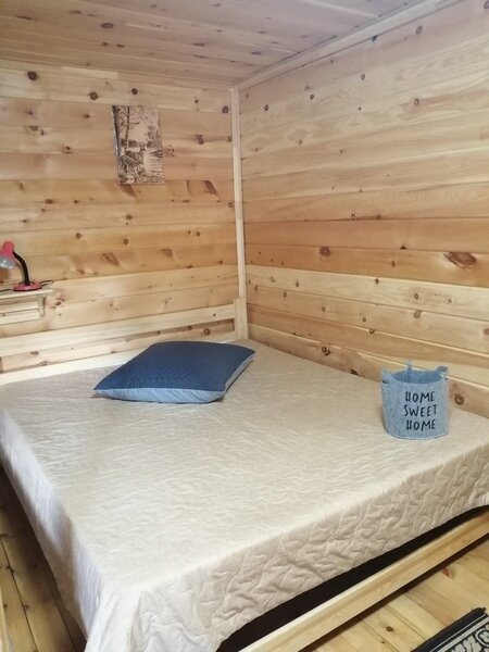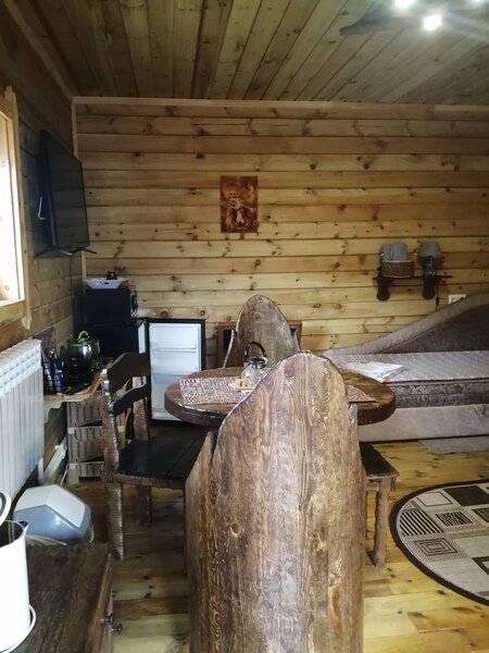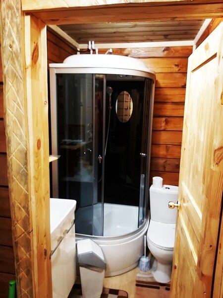 Душ, санузел, плитка, микроволновка, холодильник, телевизор внутри номера. Посуда, чайник. Два двуспальных дивана, отапливается.