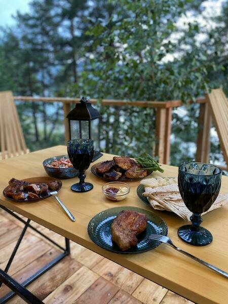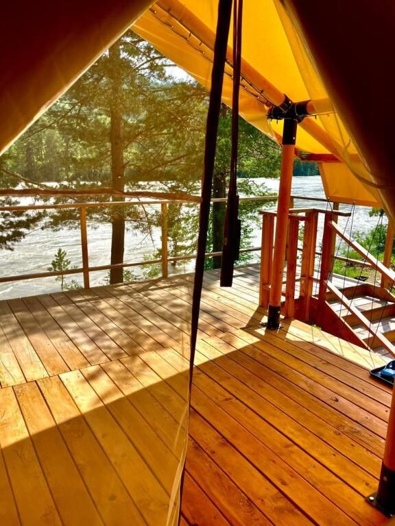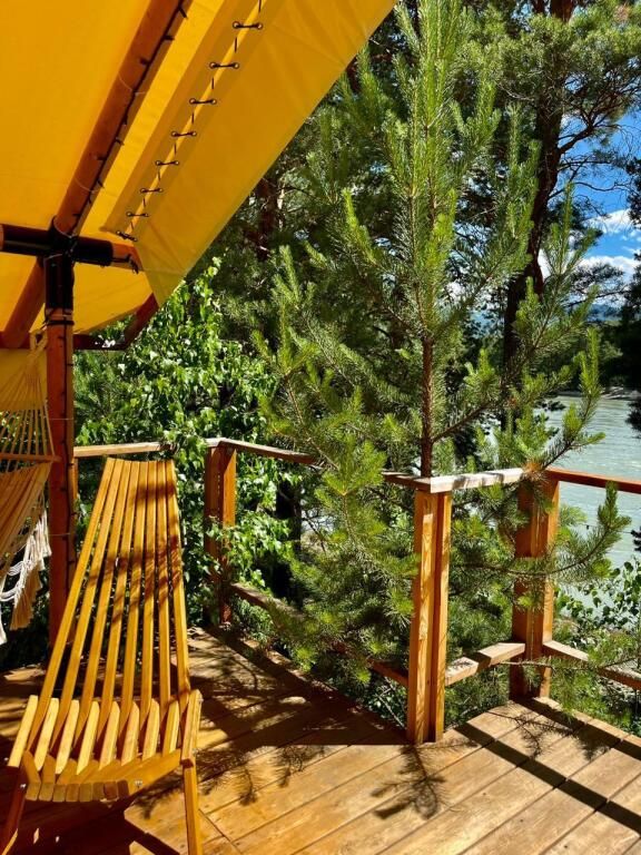 Терраса оснащенная столиком с удобными креслами из натурального дерева с видом на живописную природу! Вид на Катунь и сосны. Большая терраса (20м) под навесом. Во время дождя можно комфортно находиться на ней и любоваться природой.