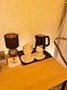Стол со всей необходимой посудой для 4 человек (тарелки 3 видов, столовые предметы, бокалы, чайный сервиз, чайник).