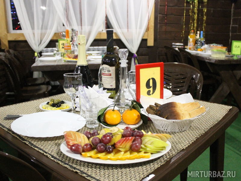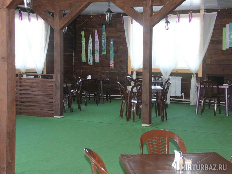 Гости базы отдыха отмечают, что в кафе уютно, как дома. Посетители снимают обувь при входе, мягкий и чистый ковролин располагает к отдыху, а ребятишки могут играть прямо на полу. Обязательно попробуйте ароматный чай на горных травах, фирменную шарлотку и мясные блюда кухни.