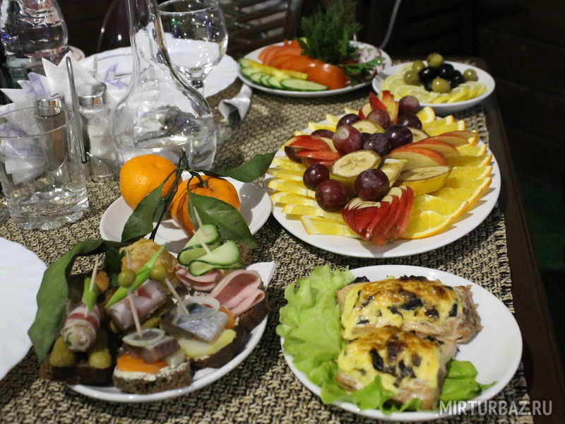 Принимаются заказы на обслуживание мероприятий, свадеб, банкетов. Для гостей базы предлагаются 3 вида меню: традиционное, вегетарианское и для гурманов. Разнообразие блюд порадует ценителей щедрой русской кухни.
