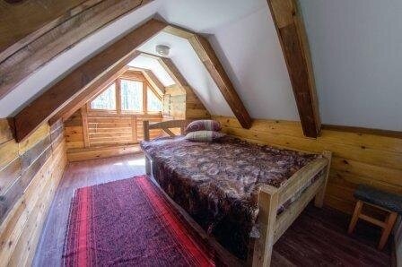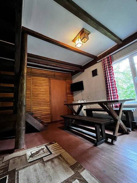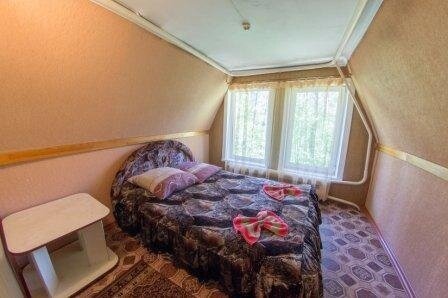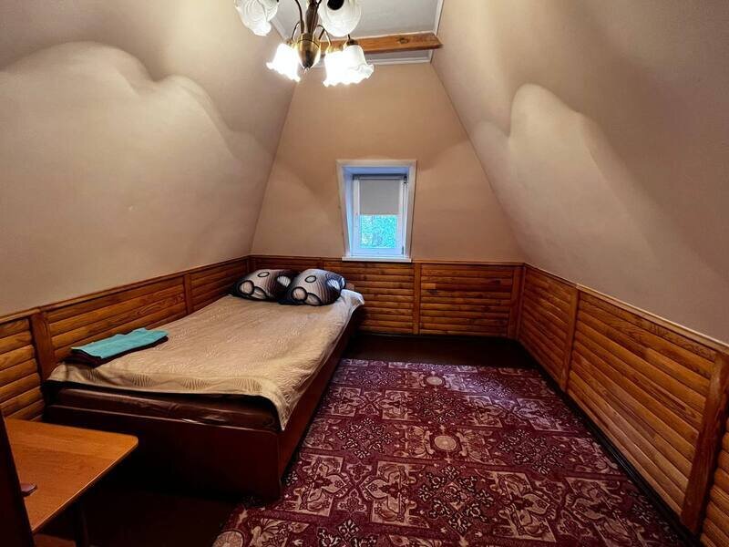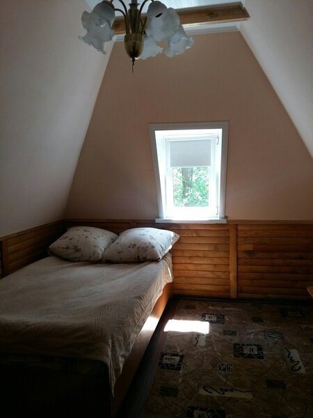 На первом этаже располагается 2 комнаты, зона кухни (холодильник, чайник, микроволновая печь), WC+душ; на втором этаже 3 комнаты и WC. Около домика зона отдыха: беседка, мангал.