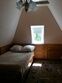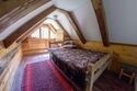 Номер с мансардой, где стоит двуспальная кровать.