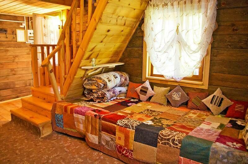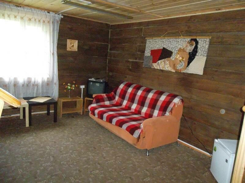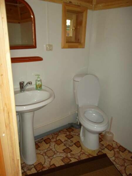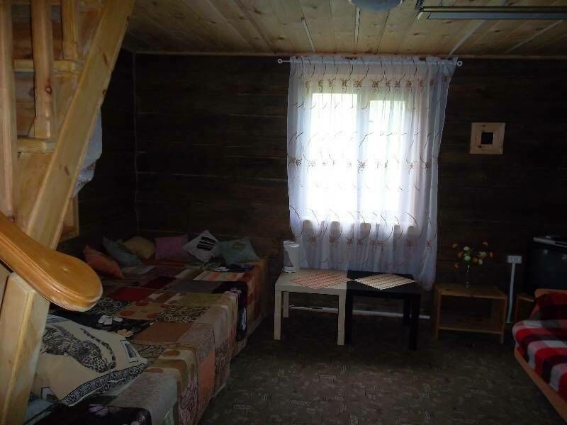 - На первом этаже широкая мягкая лежанка и раскладной диван, туалет и раковина (вода только холодная), холодильник, журнальный столик, DVD, вешалка.