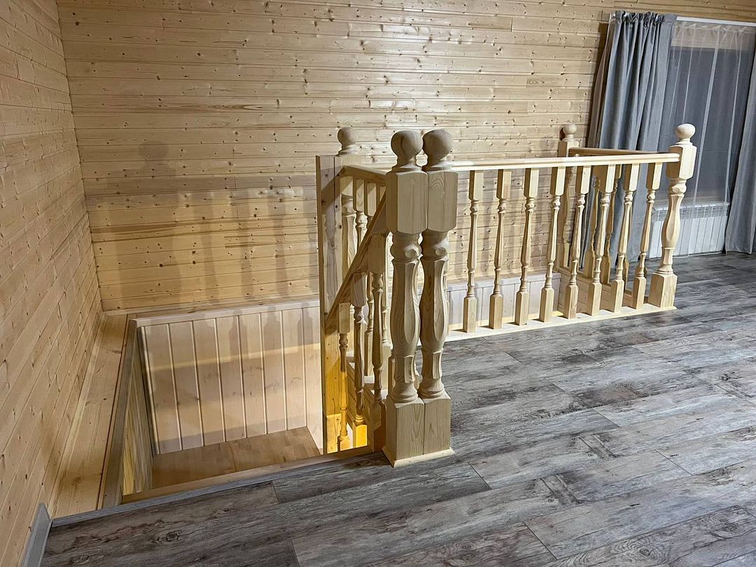 На террасе для отдыха размещены кресла и столик. Домик рассчитан на проживание одного/двух гостей. В шале представлена деревянная мебель ручной работы: двуспальная кровать, стулья, стол.
