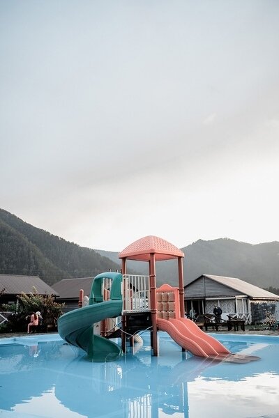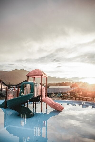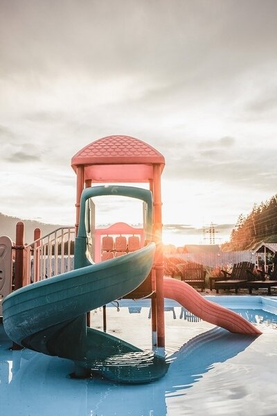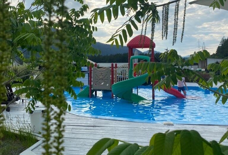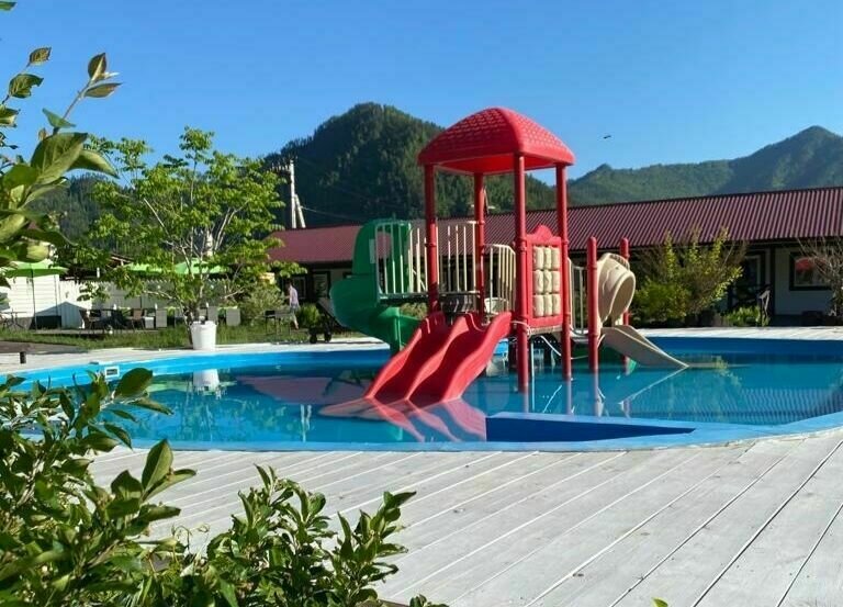 -бассейн не подогреваемый ( если солнечная погода, то ко второй половине дня вода нагревается, а если пасмурно, то детей в воду на долго не пустишь. А они очень хотят купаться и кататься с горок!)