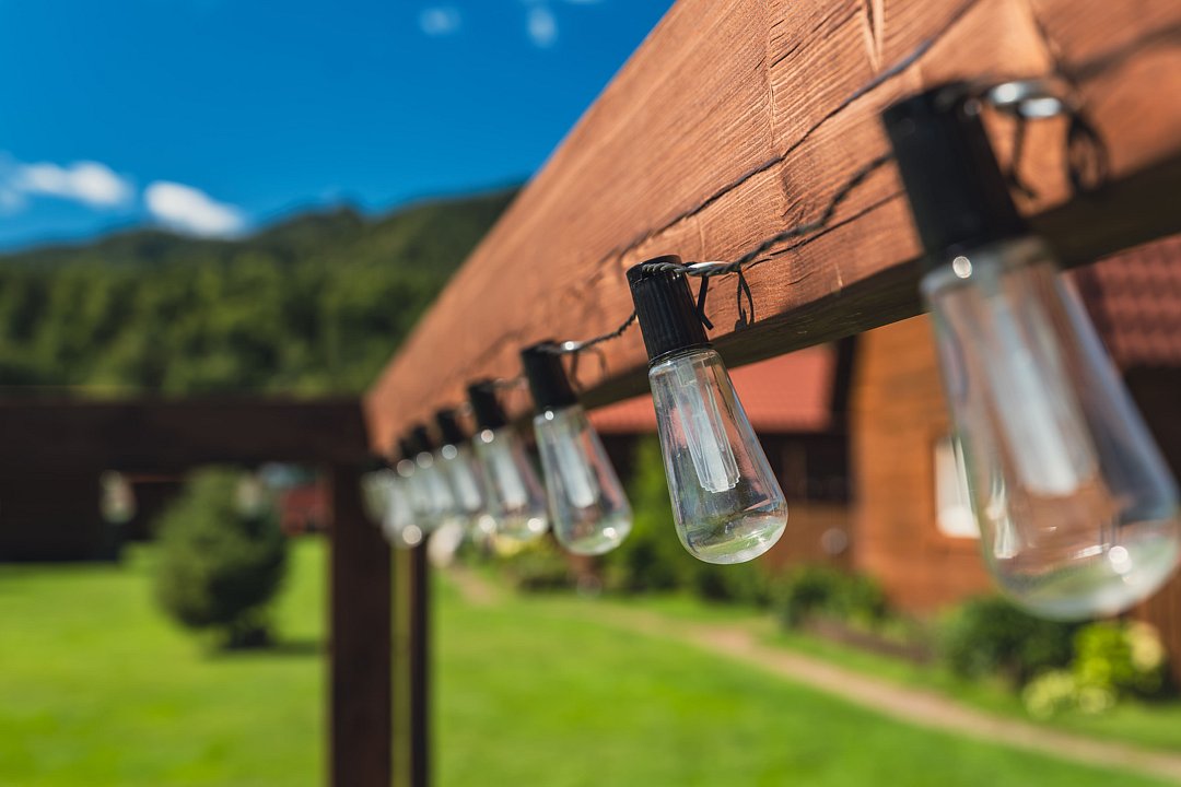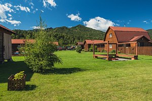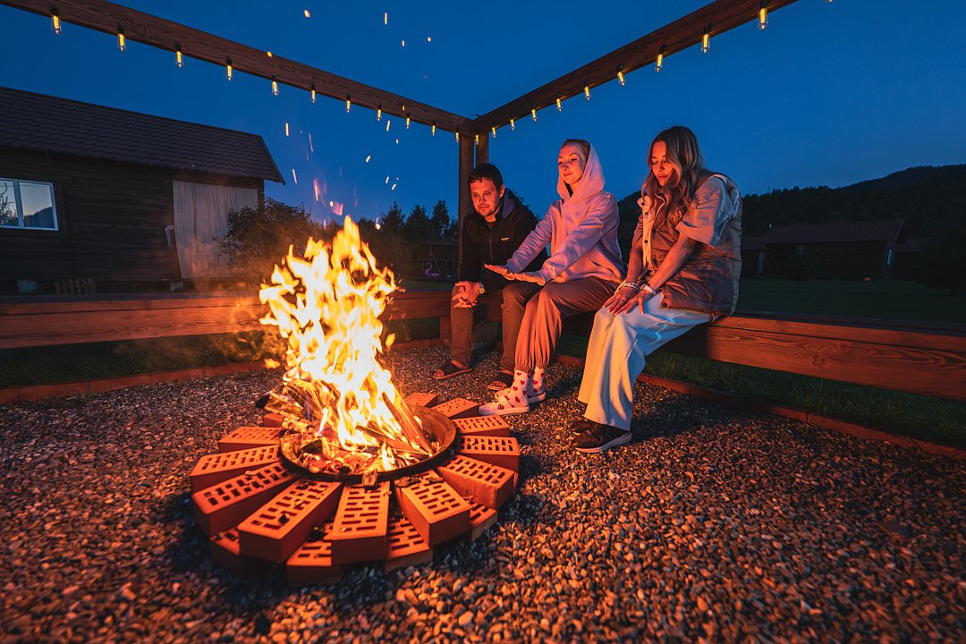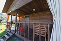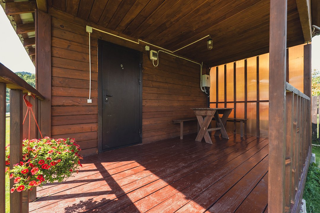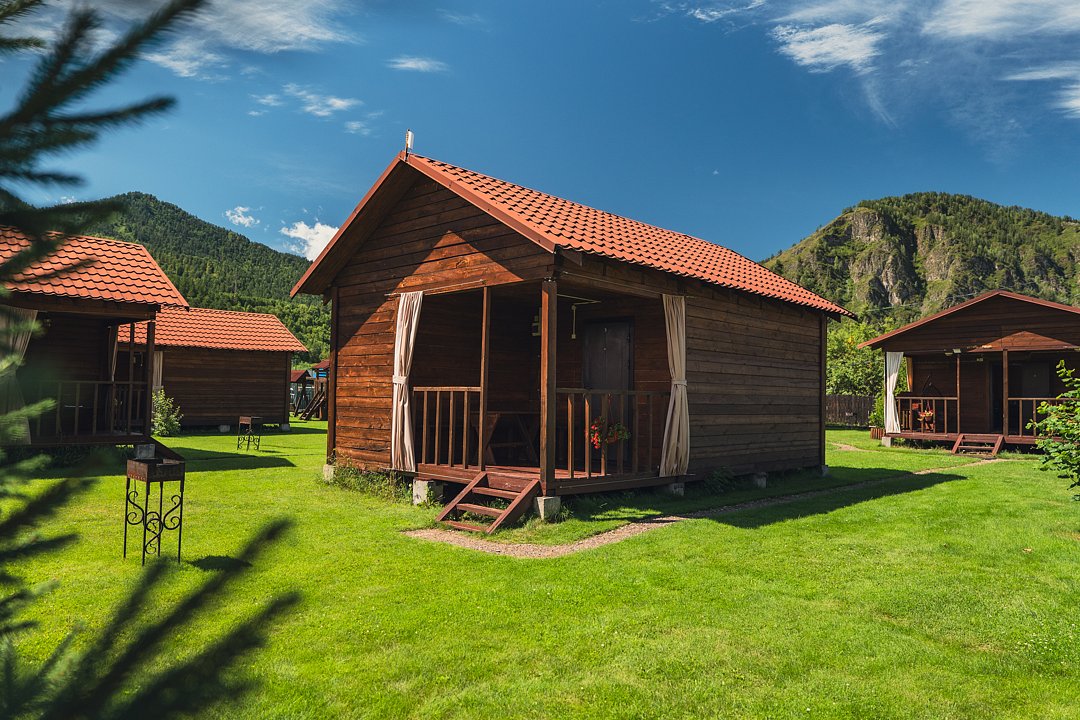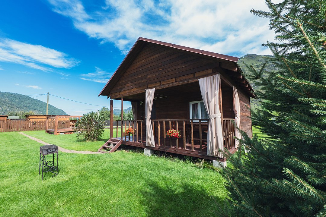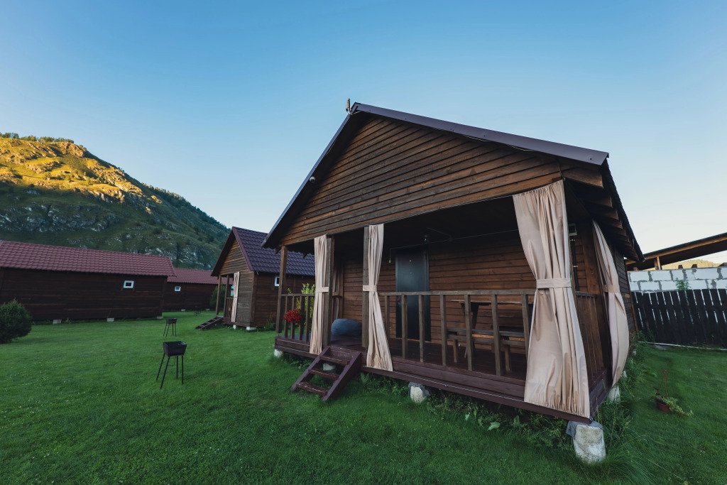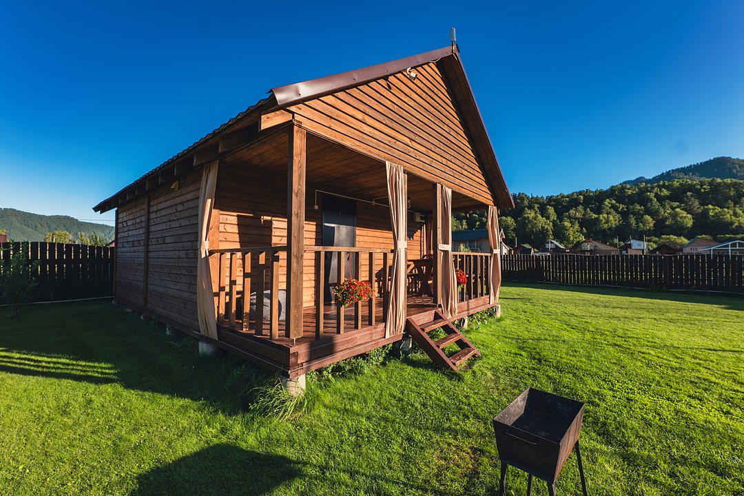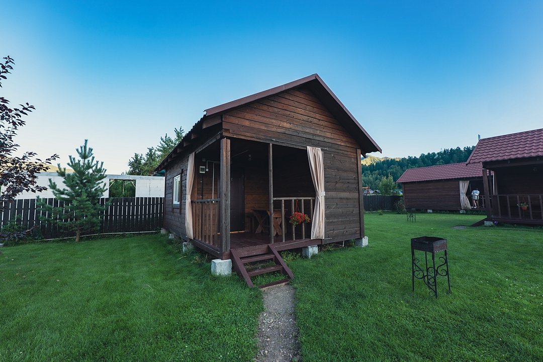 Для уединения можно выбрать один из отдельно стоящих коттеджей из бруса. Внутри созданы все условия для комфортного проживания. У каждого дома есть терраса с зоной отдыха и мангалом.