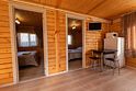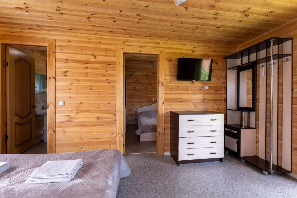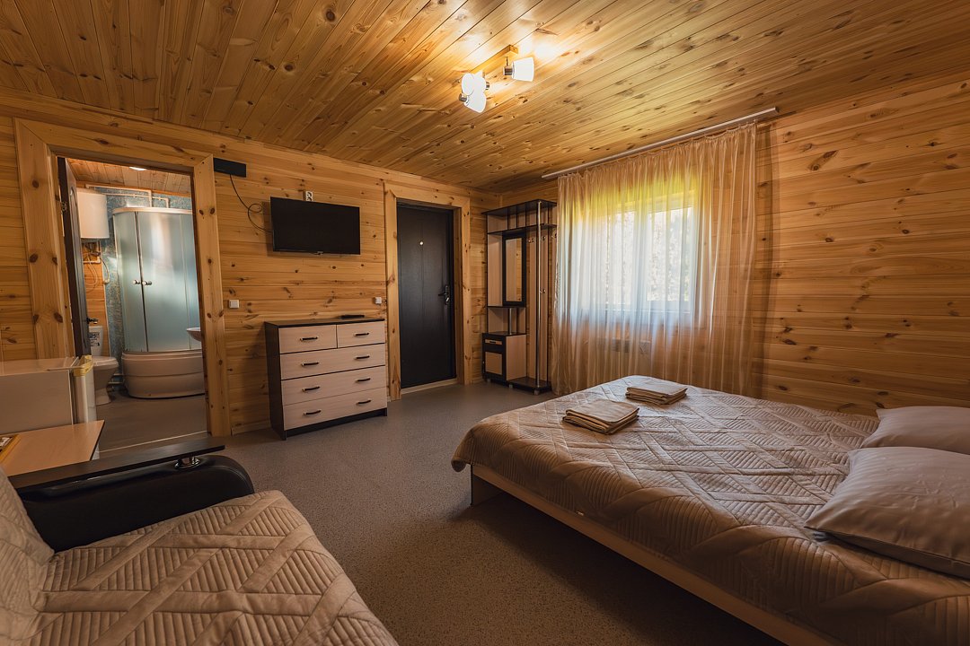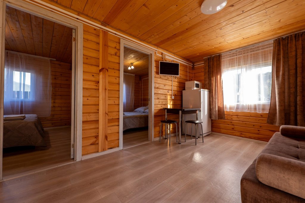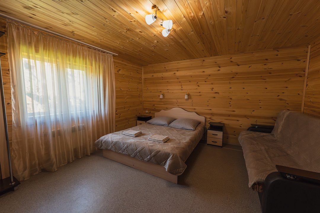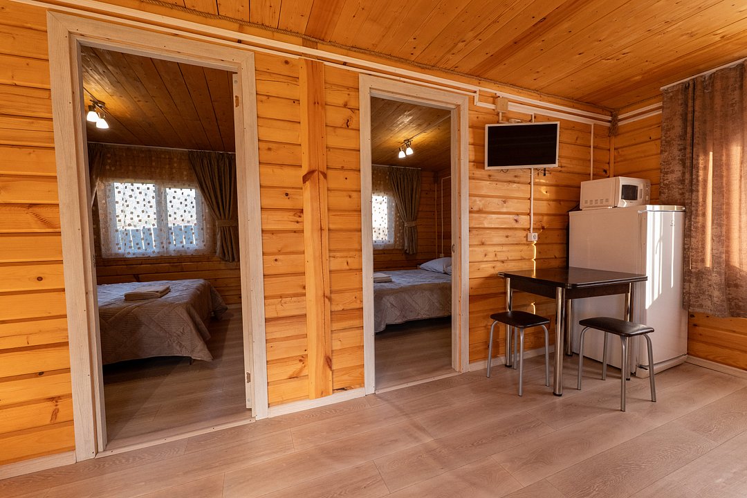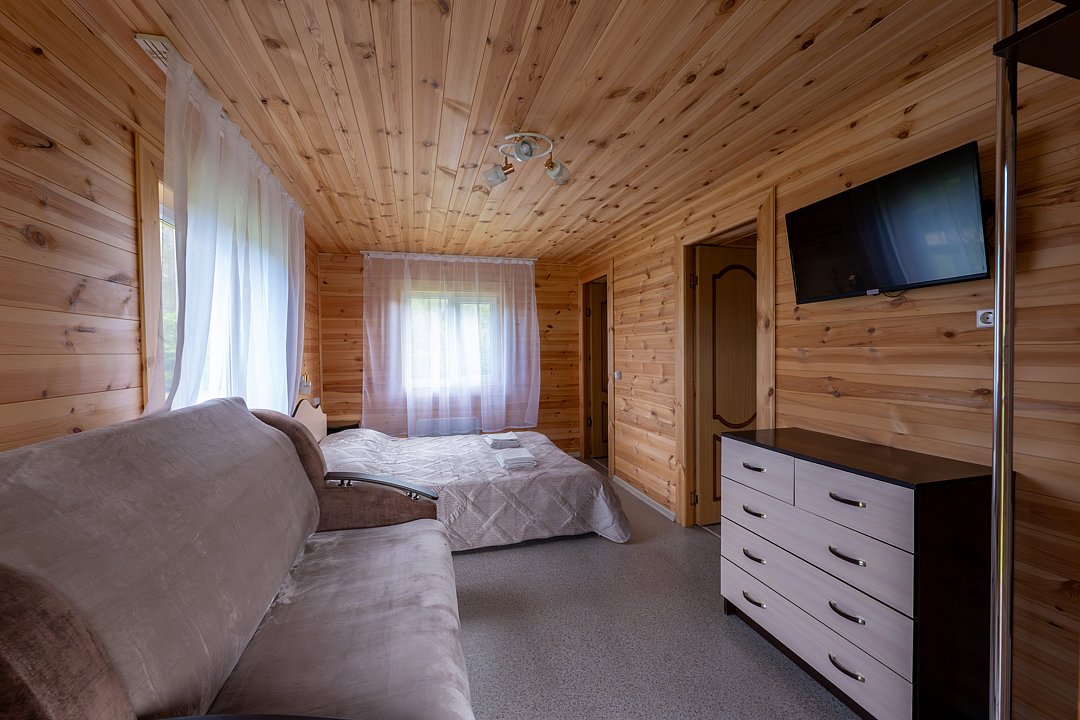 Уютный коттедж с 6 основными спальными местами. Две отдельные комнаты, смежная гостиная с оборудованной кухней. Современные удобства: микроволновка, чайник, холодильник, двуспальные кровати, диван-кровать, телевизор, санузел с душевой кабиной.
