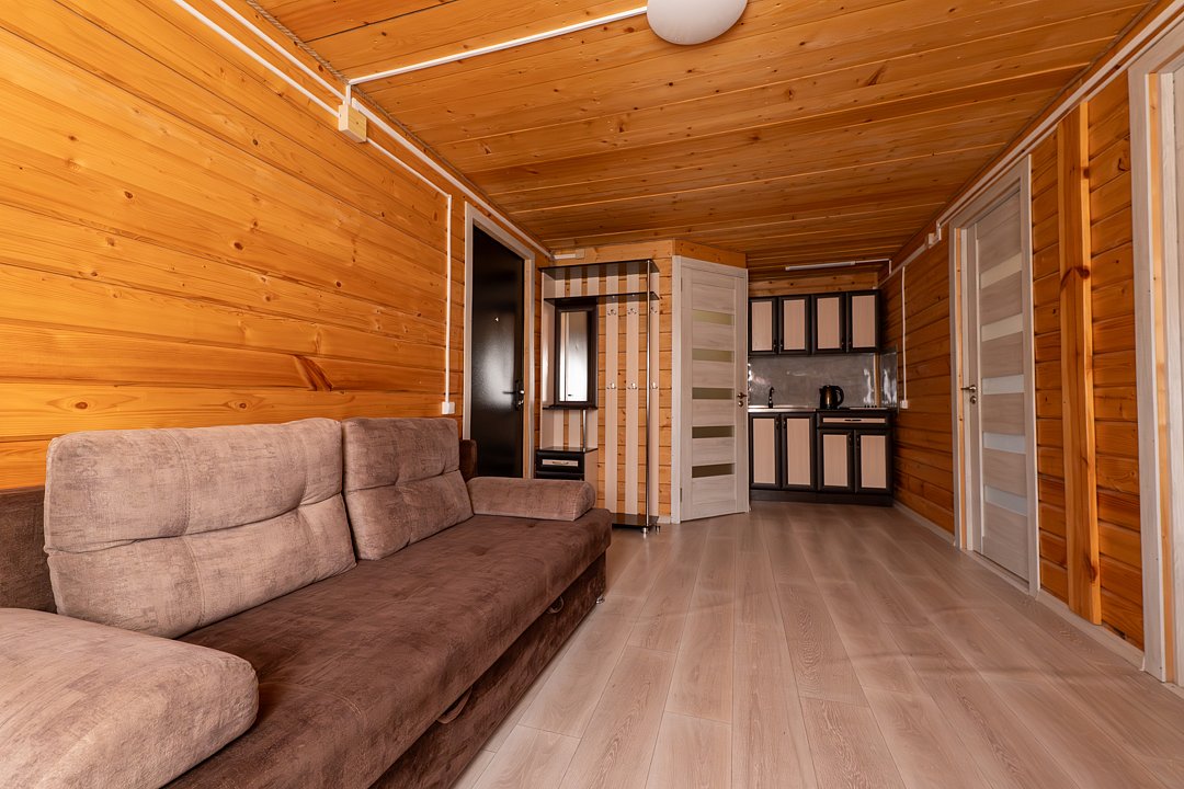 Уютный коттедж с 6 основными спальными местами. Две отдельные комнаты, смежная гостиная с оборудованной кухней и обеденной зоной. Современные удобства: микроволновка, чайник, холодильник, двуспальные кровати, диван-кровать, телевизор, санузел с душевой кабиной.