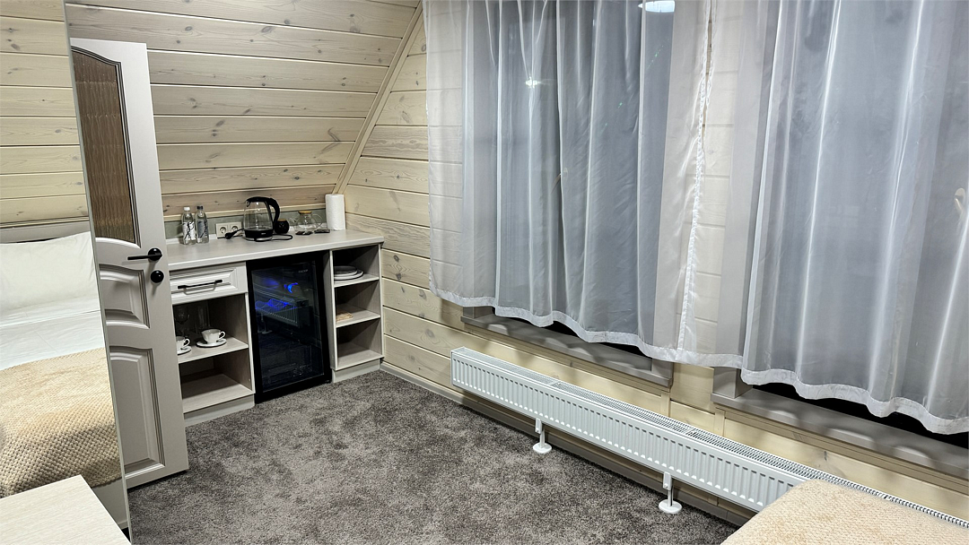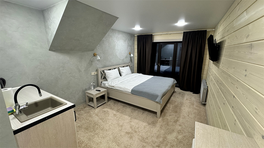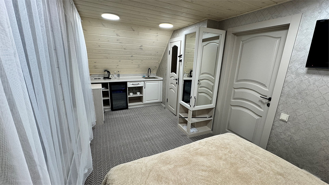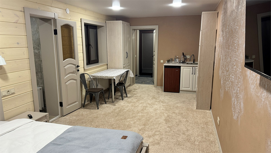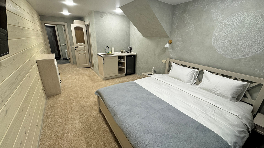 Новый номер с небольшой кухней: холодильник, чайник и посуда — всё под рукой. Номер с одной двуспальной кроватью.