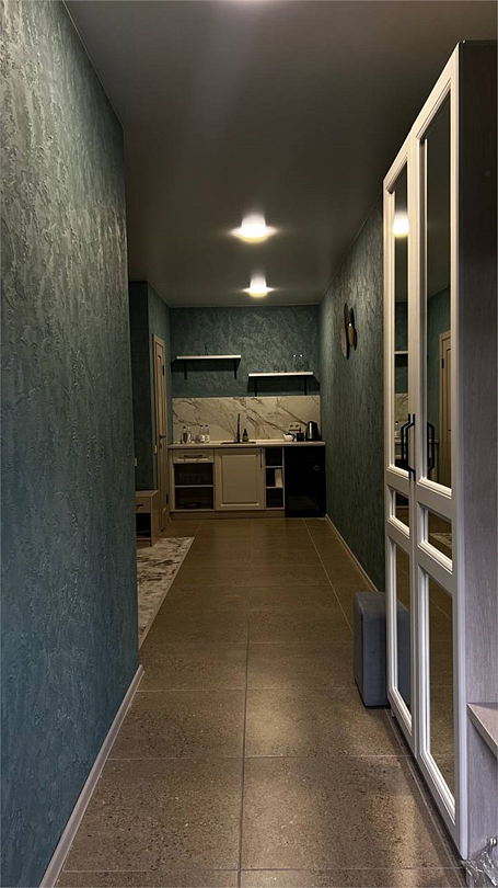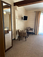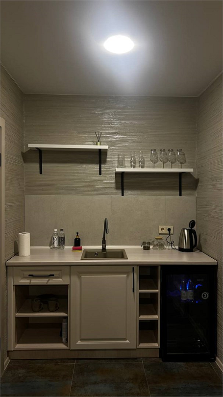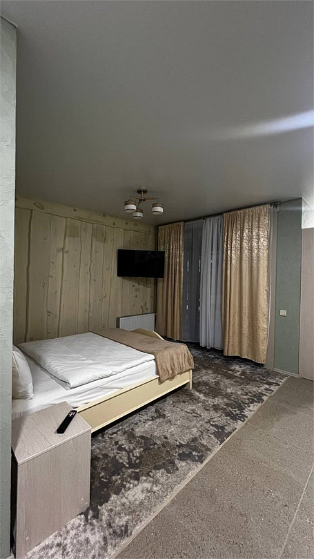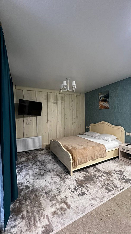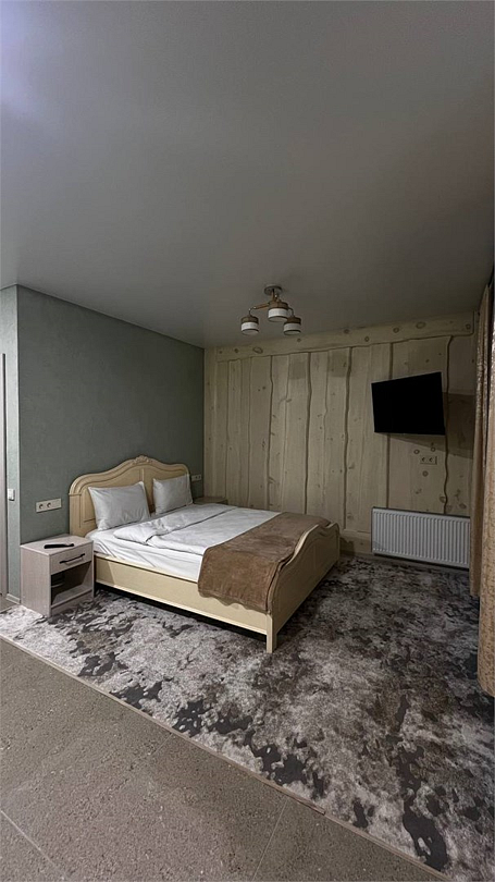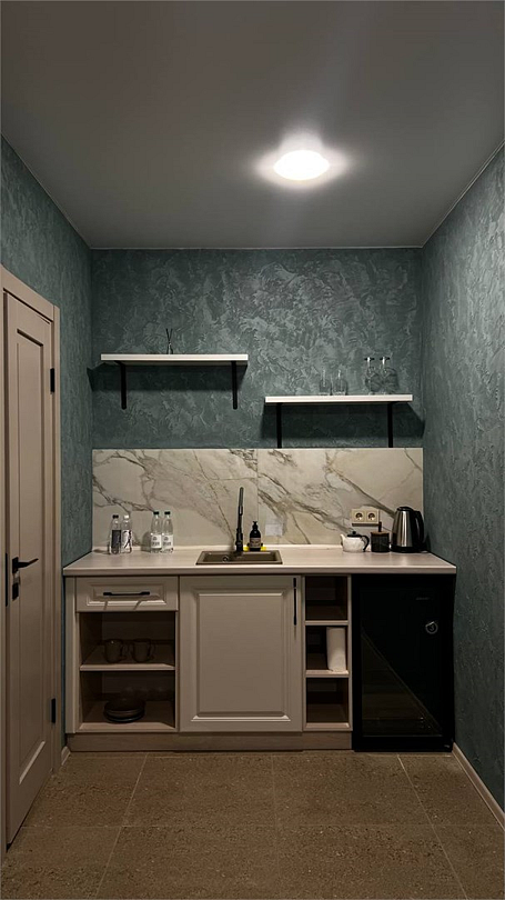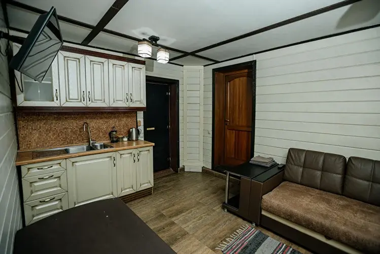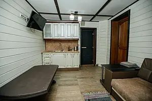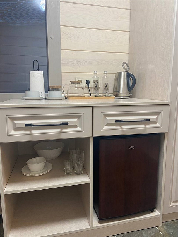 Новый номер с небольшой кухней: холодильник, чайник и посуда — всё под рукой. Номер с одной двуспальной кроватью.
