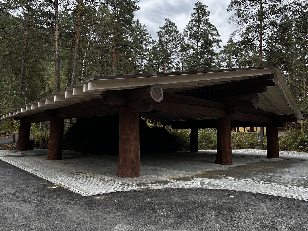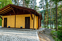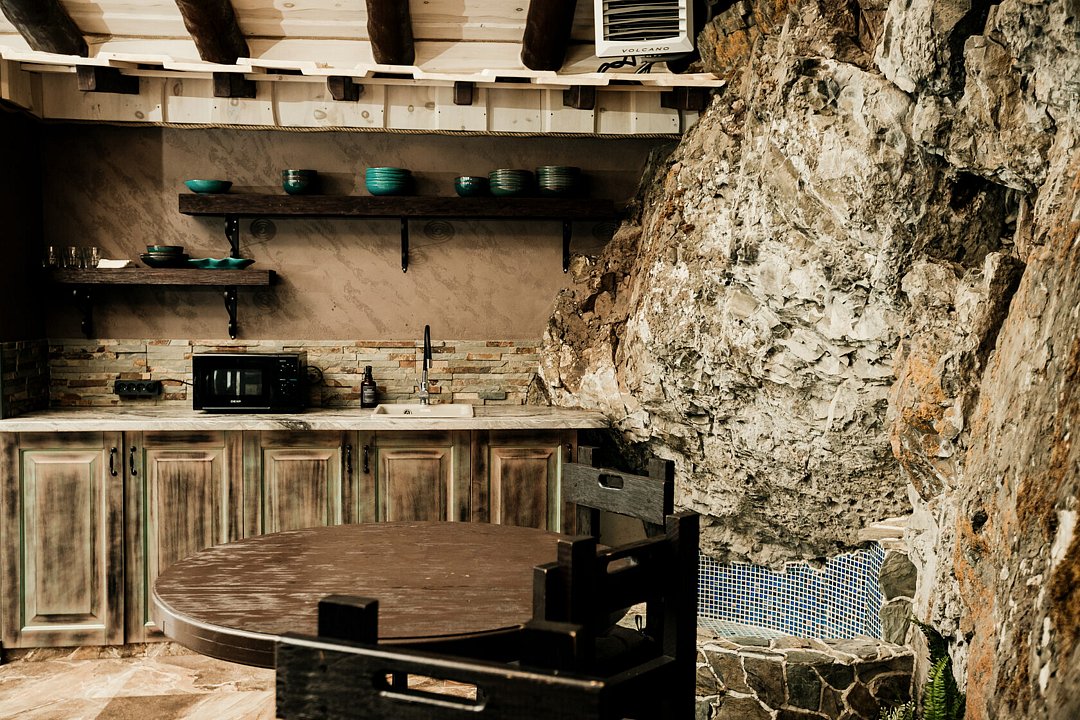 Просторная уличная беседка с одной стеной в виде настоящей скалы идеально подойдёт для встреч на свежем воздухе. Вместимость — до 100 человек.