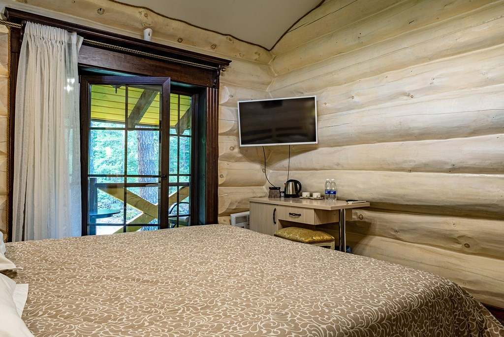 Небольшой отдельностоящий домик на двух человек. Внутри есть все необходимое для комфортного отдыха: двухместная кровать, санузел с душем, ТВ, холодильник, а также собственная веранда.