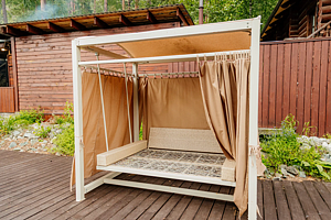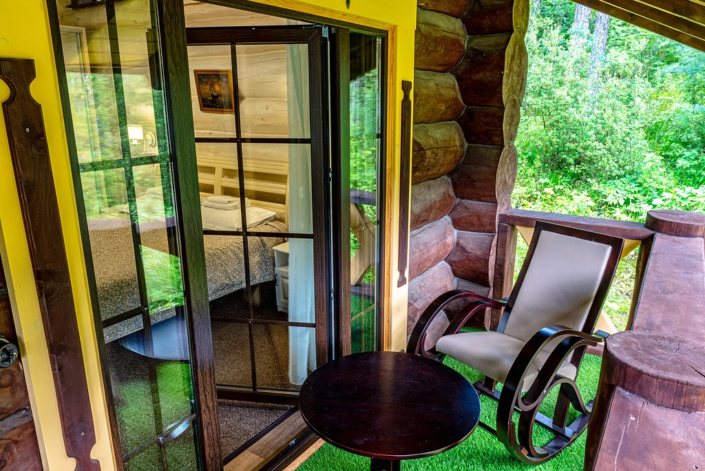 Отдельно стоящий номер в доме с видом на реку Катунь, террасой и небольшой кухней: холодильник, чайник и посуда — всё под рукой. В каждом домике два номера с отдельными входами, рассчитаны на двоих с возможностью двух дополнительных мест.