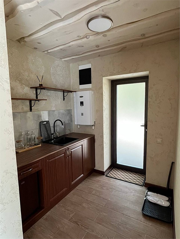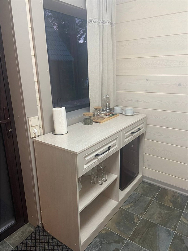 Новый номер с небольшой кухней: холодильник, чайник и посуда — всё под рукой. Номер с одной двуспальной кроватью и собственной террасой.