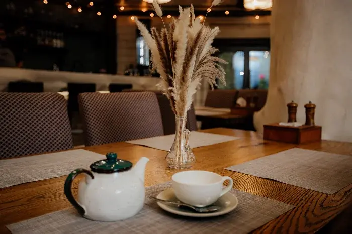 Лаконичный зал с интерьером в природном стиле. Здесь проходят завтраки для постояльцев отеля, а также его можно арендовать под большие группы.