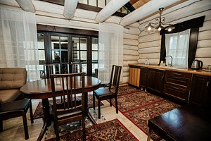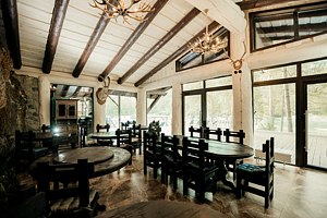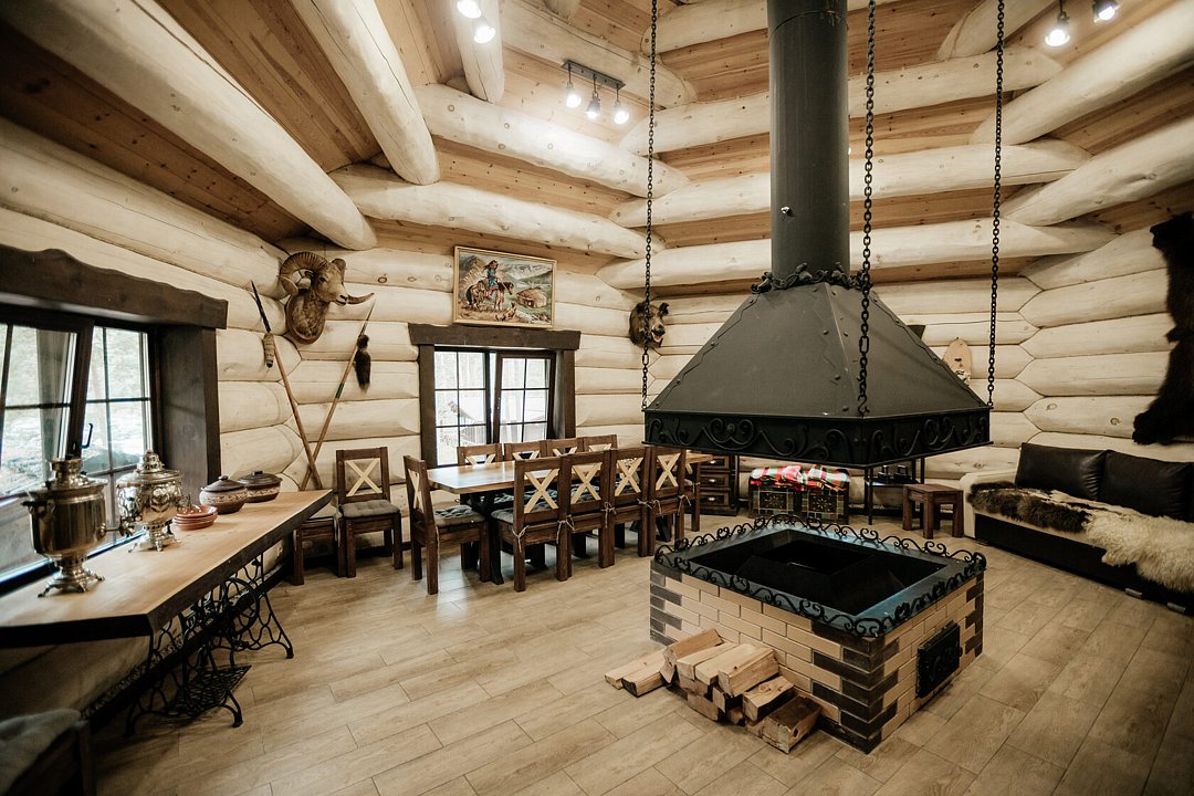 Уютное пространство в традиционном алтайском стиле с очагом в центре создаёт особую атмосферу для душевных встреч. Вместимость — до 20 человек.