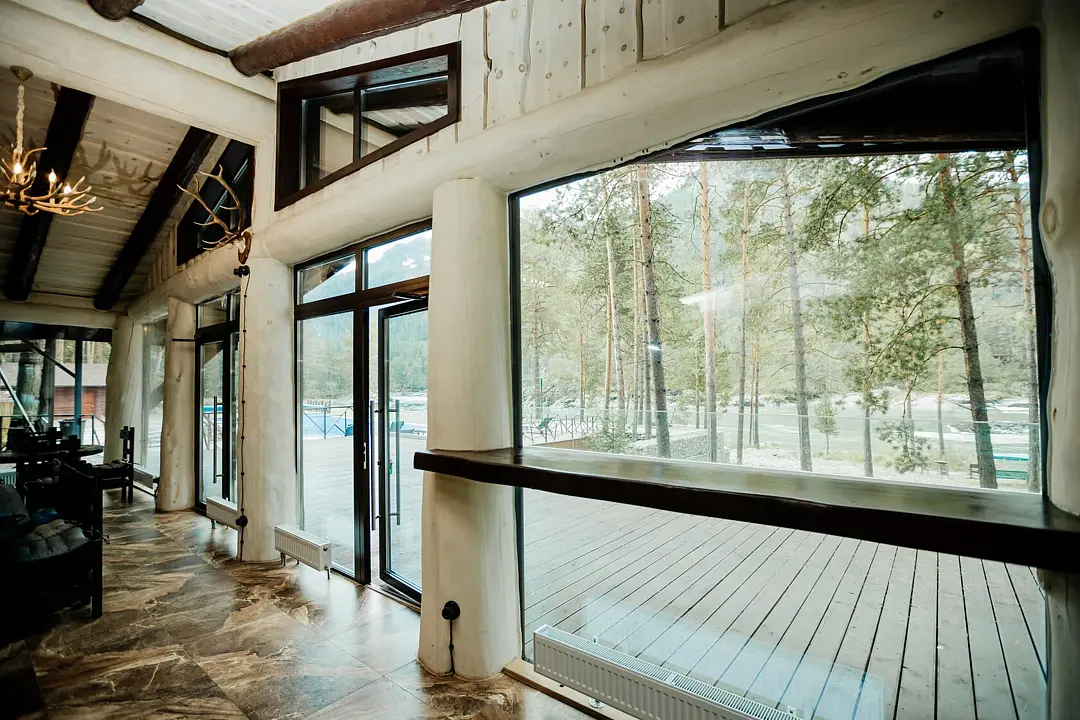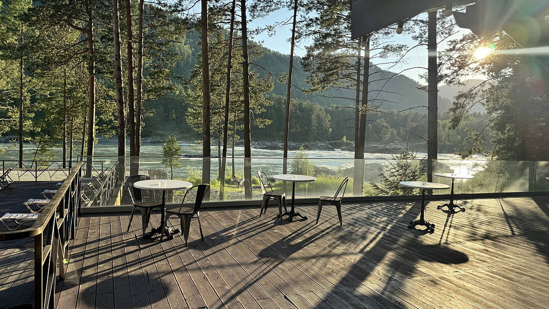 Вторая стена банкетного зала — панорамные окна от пола до потолка, открывающие вид на алтайские горы и реку Катунь. Это не просто зал, а пространство, где природа становится живым фоном для особенных воспоминаний. Рядом с банкетным залом есть просторная терраса и летний бар