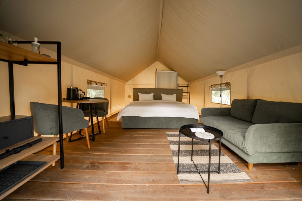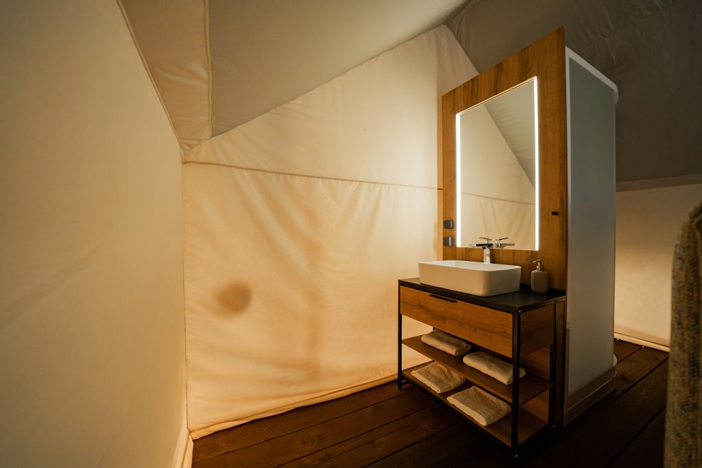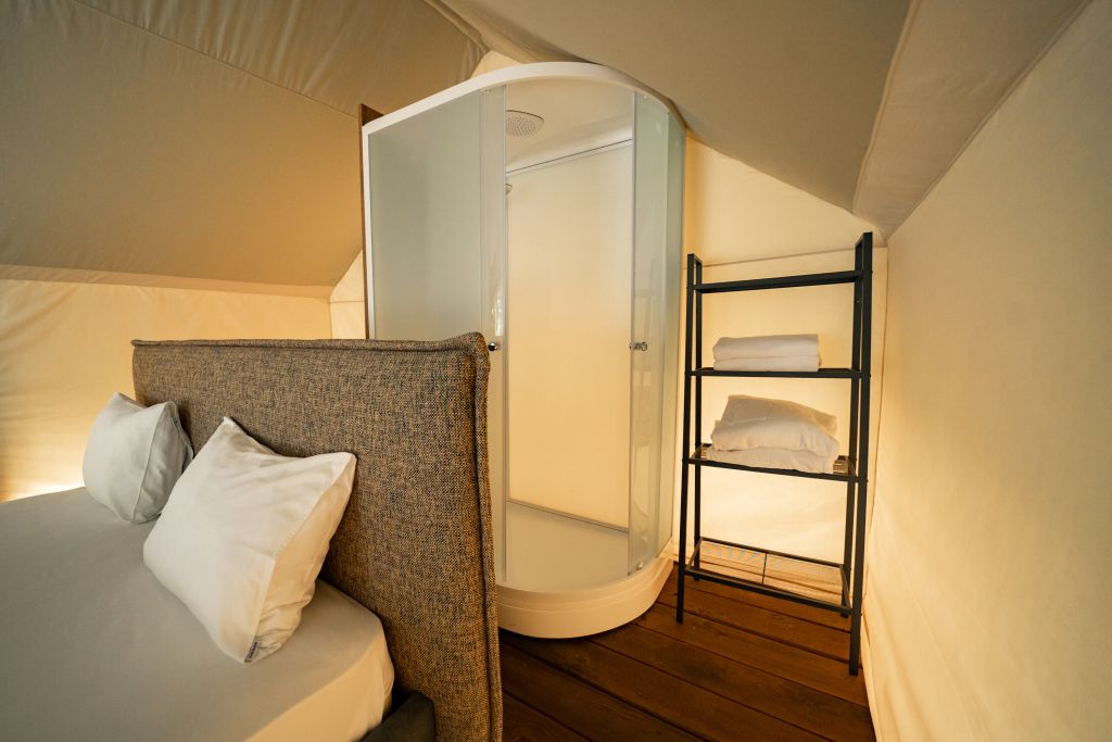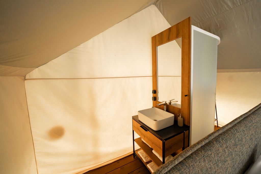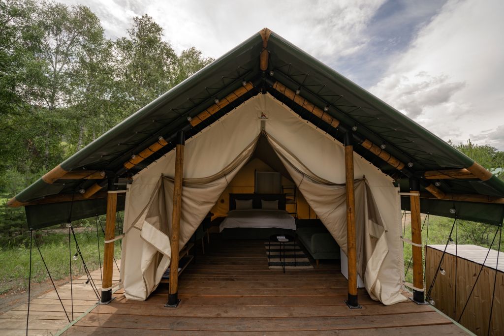 Гостям предлагаются современные тент-хаусы, внутри которых царит уютная, практически домашняя атмосфера. Кроме жилой зоны, в тенте имеется санитарный отсек с комфортным душем. Туалеты расположены неподалеку от жилищ, на отдельном участке. Некоторые тенты оснащены удобной купелью.