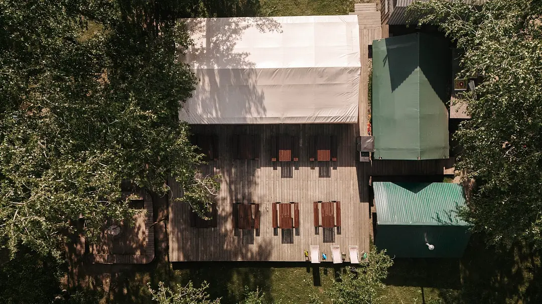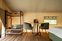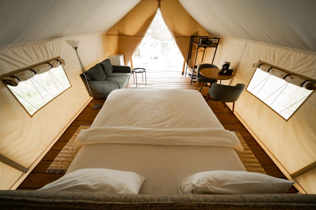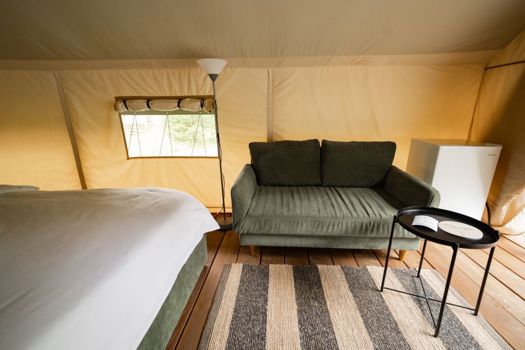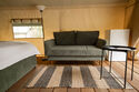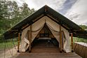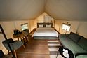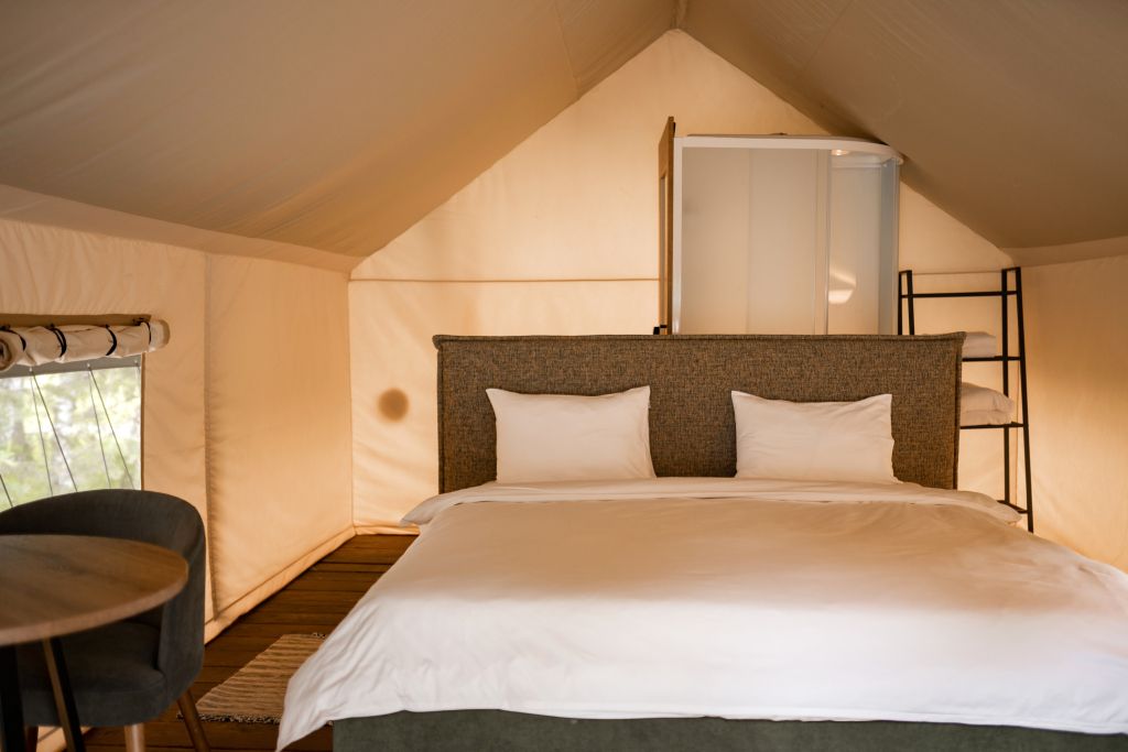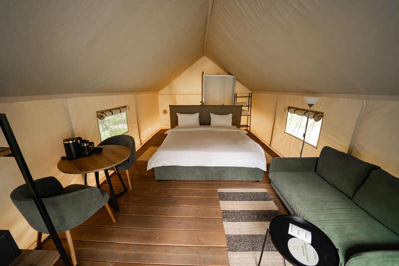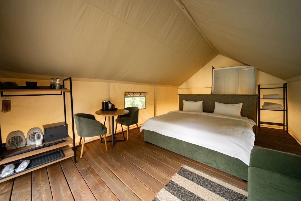 Гостям предлагаются современные тент-хаусы, внутри которых царит уютная, практически домашняя атмосфера. Кроме жилой зоны, в тенте имеется санитарный отсек с комфортным душем. Туалеты расположены неподалеку от жилищ, на отдельном участке. Некоторые тенты оснащены удобной купелью.