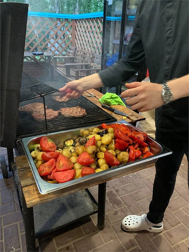 Полностью оборудованная гриль-зона: шампура, решетки, мангалы, бочка гриль, казаны, подвесы для казанов, термометр для мяса и всякие штучки для гриля.