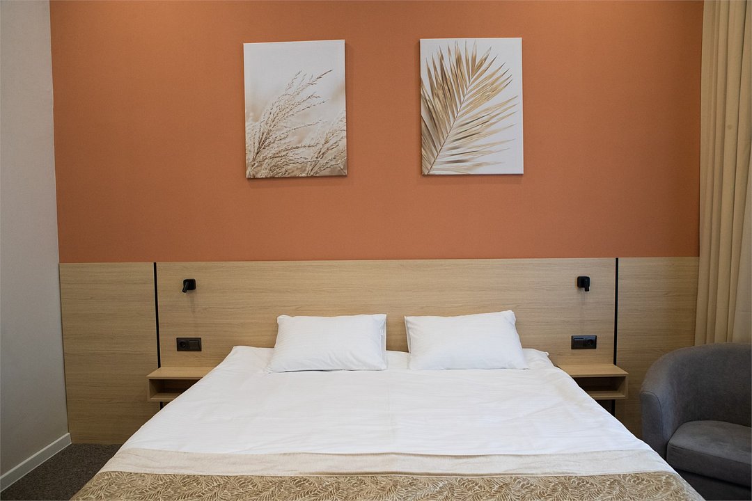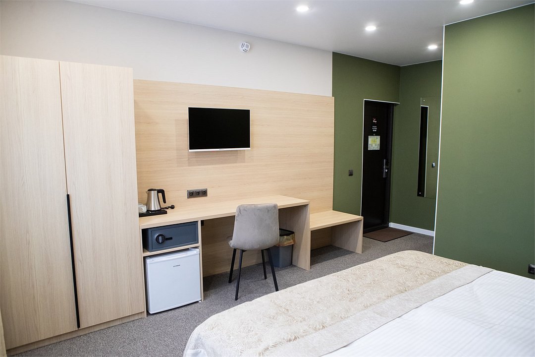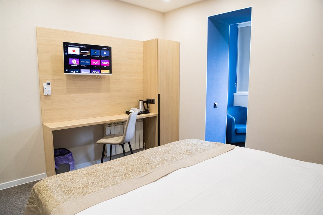 кабельное телевидение, интерактивное телевидение, Wi-Fi, кондиционер, светильник, фен, ванная комната, душевая кабина, банные полотенца, тапочки, две односпальные или большая двуспальная кровать, ортопедический матрас, тумбы, стулья, шкаф для одежды, вешалки, обеденный стол, две комнаты, чайный набор, набор посуды, сейф, чайник, унитаз, раковина, ковровое покрытие, отопление, душ, вид на город, вид во двор, стаканы, столовые приборы, стол, туалетные средства, туалет, раскладной диван, телевизор с плоским экраном, мини-холодильник, номер для некурящих, чайная станция, двуспальный раскладной диван-кровать, мыло, зеркало в полный рост, можно с питомцами, Android TVВ гостиничном номере