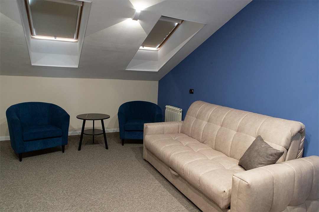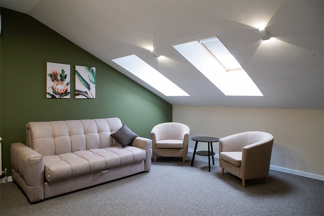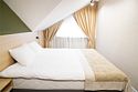 Двухкомнатный номер для размещения до 4х человек. Этот уютный номер оформлен в современном стиле с преобладанием спокойных оттенков, что создает атмосферу комфорта и расслабления. В пространстве спальной зоны установлена большая кровать 180*200 с изголовьем, при необходимости кровати можно разделить. Розетки, выключатели и светильники располагаются по обе стороны кровати. Гостиная зона оборудована удобным двуспальным, раскладным диваном и креслами, где можно проводить вечера за приятной беседой или просмотром фильма, а мансардные окна добавляют комнате естественное освещение и эстетическую привлекательность. Номер оборудован собственной ванной комнатой с душевой кабиной. В ванной комнате имеется фен, полотенца и туалетные принадлежности. Все номера Гостевого дома оборудованы кондиционером, мини холодильником, чайной станцией и сейфом.Услуги и удобства