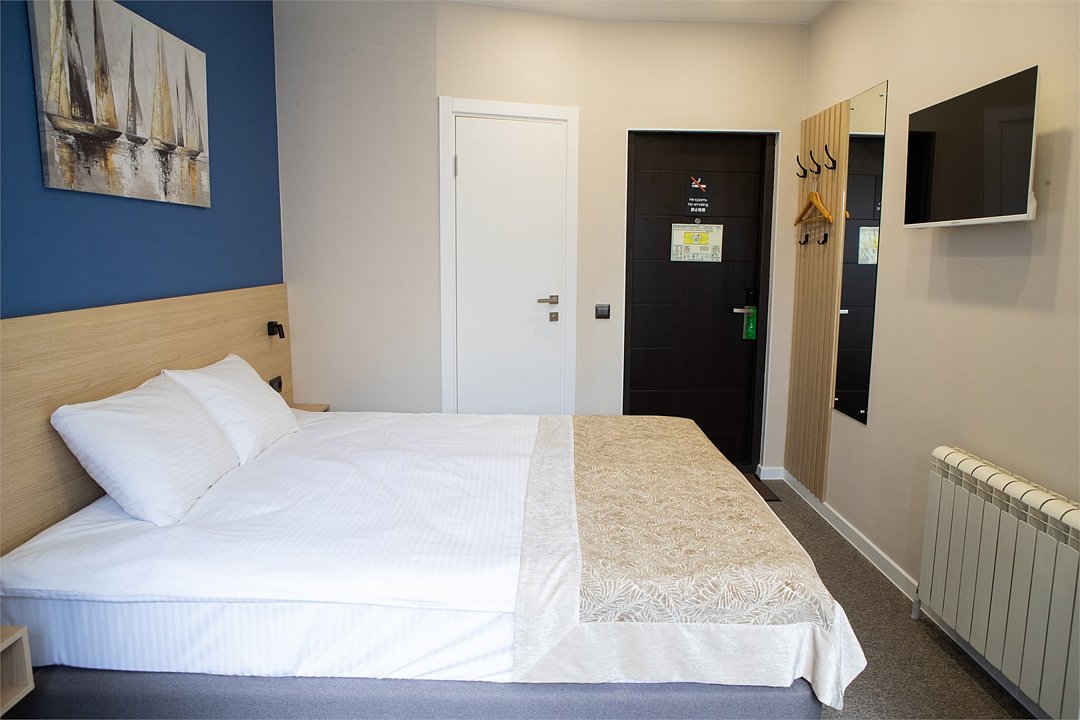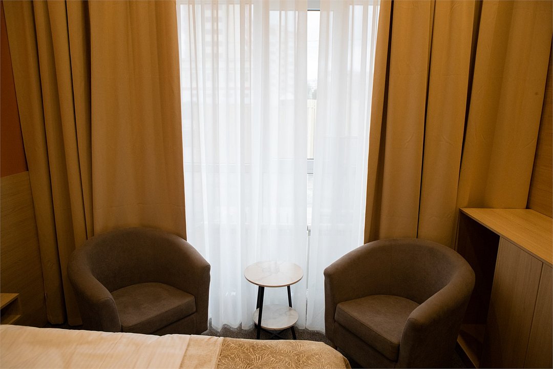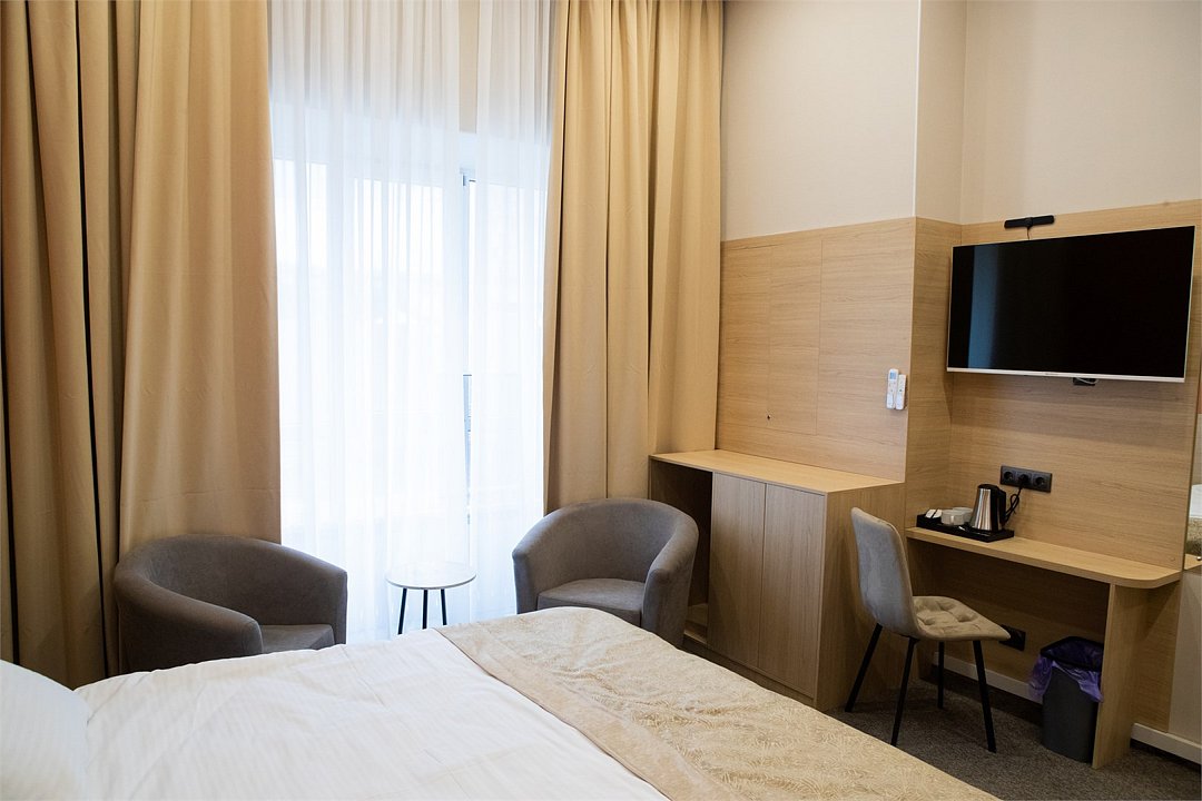 спутниковое телевидение, кабельное телевидение, интерактивное телевидение, Wi-Fi, кондиционер, светильник, фен, электронные замки, утюг, душевая кабина, санузел, водонагреватель, банные полотенца, тапочки, две односпальные или большая двуспальная кровать, ортопедический матрас, тумбы, стулья, шкаф для одежды, вешалки, багажная тумба, зеркало, чайный набор, сейф, чайник, раковина, ковровое покрытие, отопление, душ, вид на город, стаканы, столовые приборы, стол, туалетные средства, туалет, телевизор с плоским экраном, мини-холодильник, номер для некурящих, чайная станция, уборка номера, частный двор, мыло, международная розетка, можно с питомцамиВ гостиничном номере