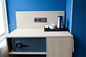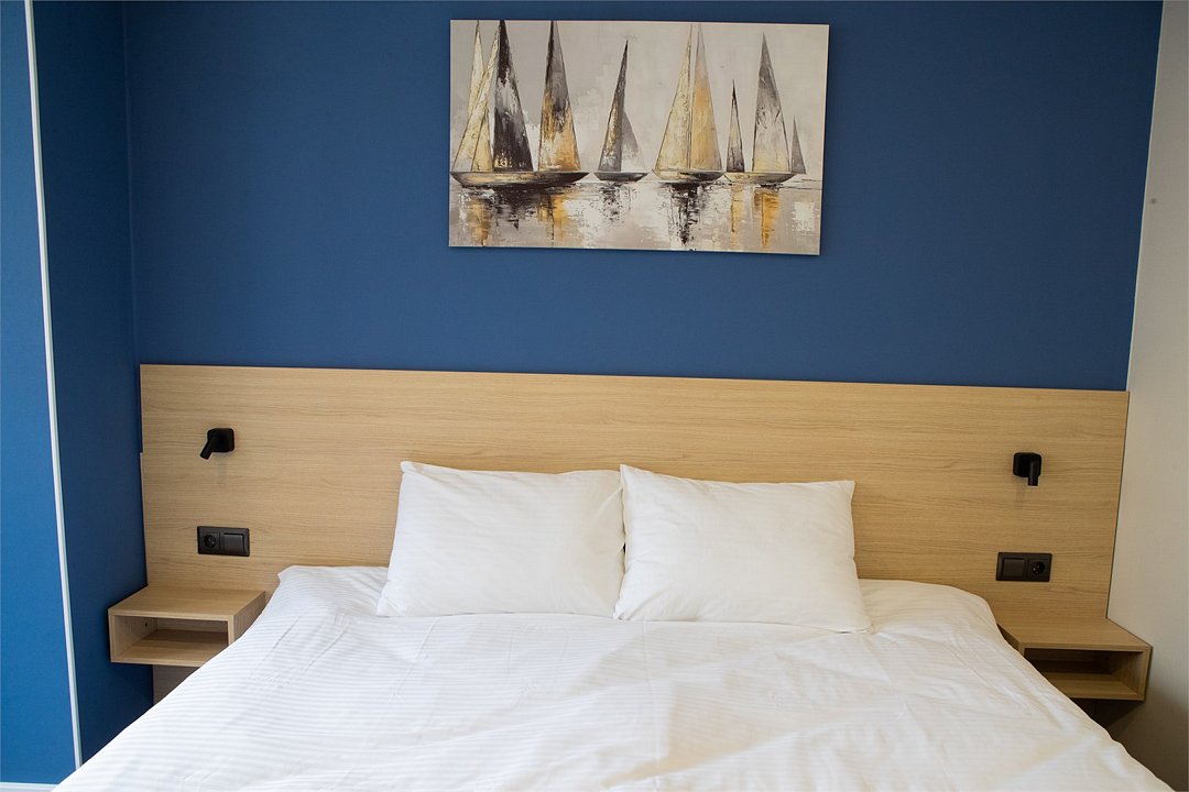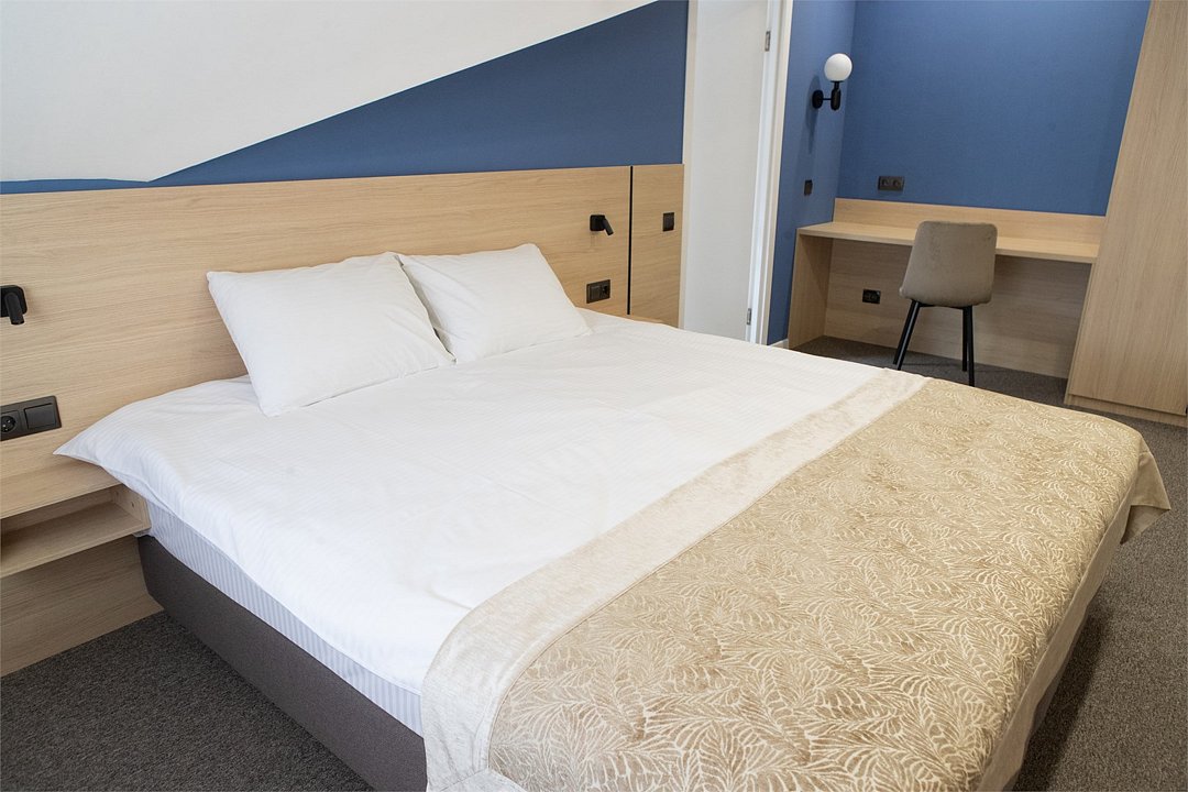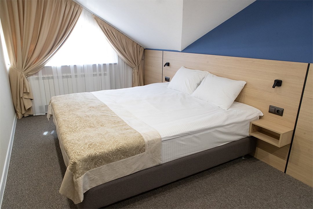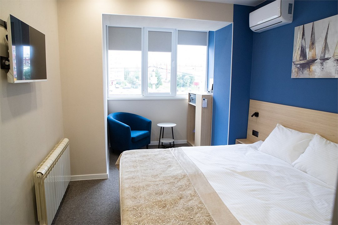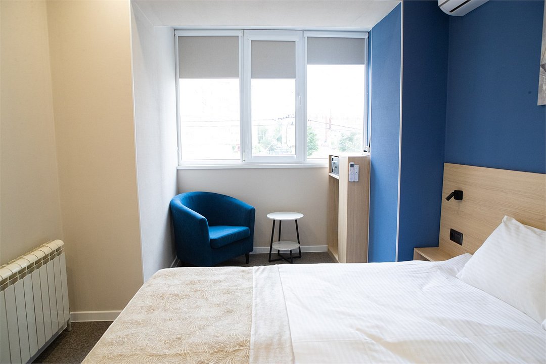 Стандарт мини отличный выбор для размещения до 2х человек. Номер оформлен в современном стиле с акцентом на комфорт и функциональность. Приятные синие оттенки стен создают спокойную атмосферу, а большие окна обеспечивают хорошее естественное освещение. В комнате располагается удобная двуспальная кровать 180*200. При необходимости кровать можно раздвинуть. Для удобства гостей предусмотрено мягкое кресло с небольшим журнальным столиком. Ванная комната оборудована современной душевой кабиной с прозрачными стеклянными дверцами и стильной плиткой в теплых тонах. В ванной комнате имеется фен, полотенца и туалетные принадлежности. Все номера Гостевого дома оборудованы кондиционерами, мини холодильником, чайной станцией и сейфом.Услуги и удобства